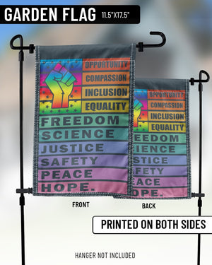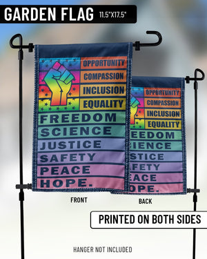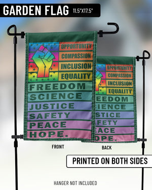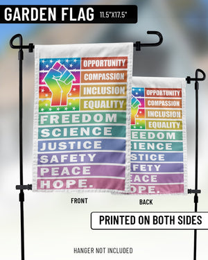 Showcase your commitment to justice, inclusion, and equality with this vibrant yard flag. Designed with a bold rainbow fist and powerful words like "Opportunity, Compassion, Inclusion, Equality, Freedom, Science, Justice, Safety, Peace, Hope," this flag is a statement of unity and progress. Whether for your home, garden, or an event, this flag spreads a message of diversity, kindness, and a better future for all. Made from durable, weather-resistant fabric, it’s perfect for year-round display. Let your voice be seen and your values stand strong!
