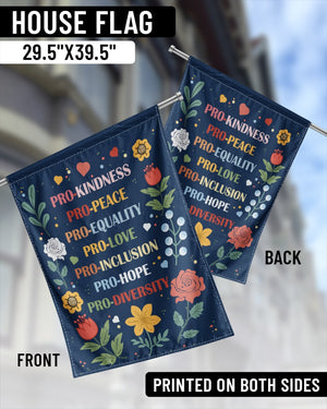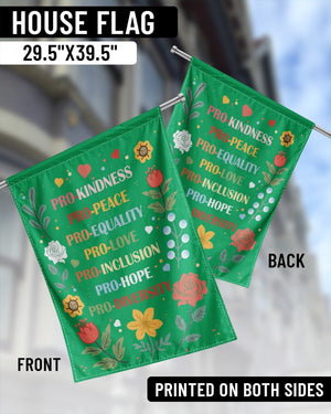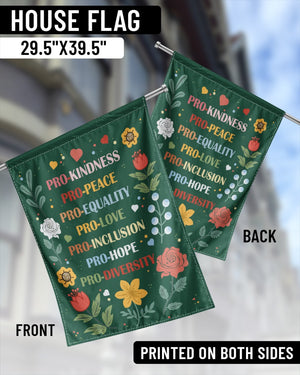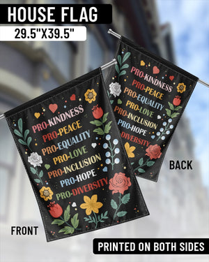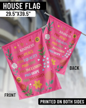 This garden flag carries a bold and colorful message of unity and compassion. The design highlights empowering words: “PRO-KINDNESS • PRO-PEACE • PRO-EQUALITY • PRO-LOVE • PRO-INCLUSION • PRO-HOPE • PRO-DIVERSITY” surrounded by bright flowers and hearts. A beautiful way to decorate your yard or garden while standing for justice, love, and equality. Perfect for women over 55, activists, and anyone who wants to show pride in progressive values and inclusivity.
