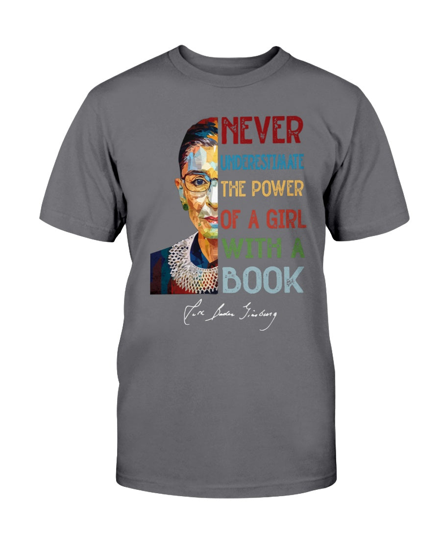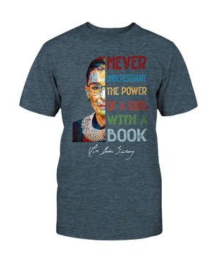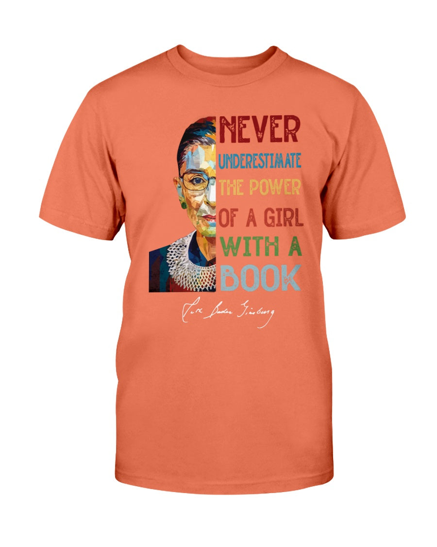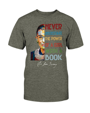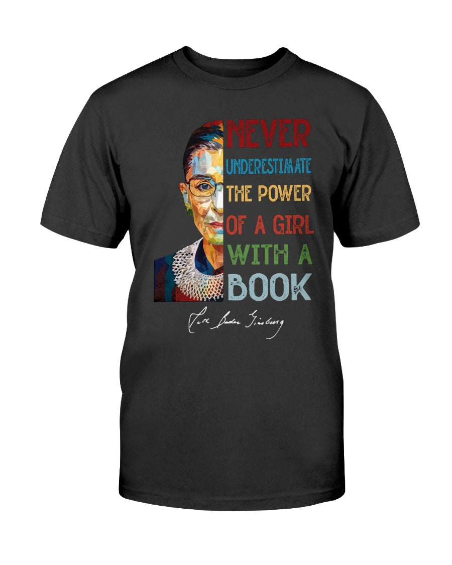 Celebrate strength, intelligence, and empowerment with this bold design featuring Ruth Bader Ginsburg and her inspiring quote: “Never Underestimate The Power Of A Girl With A Book.” This shirt combines vivid colors and a modern graphic portrait of RBG to honor women who rise through knowledge and courage. Made from soft, breathable cotton — perfect for book lovers, feminists, and anyone who believes in the power of education and equality.