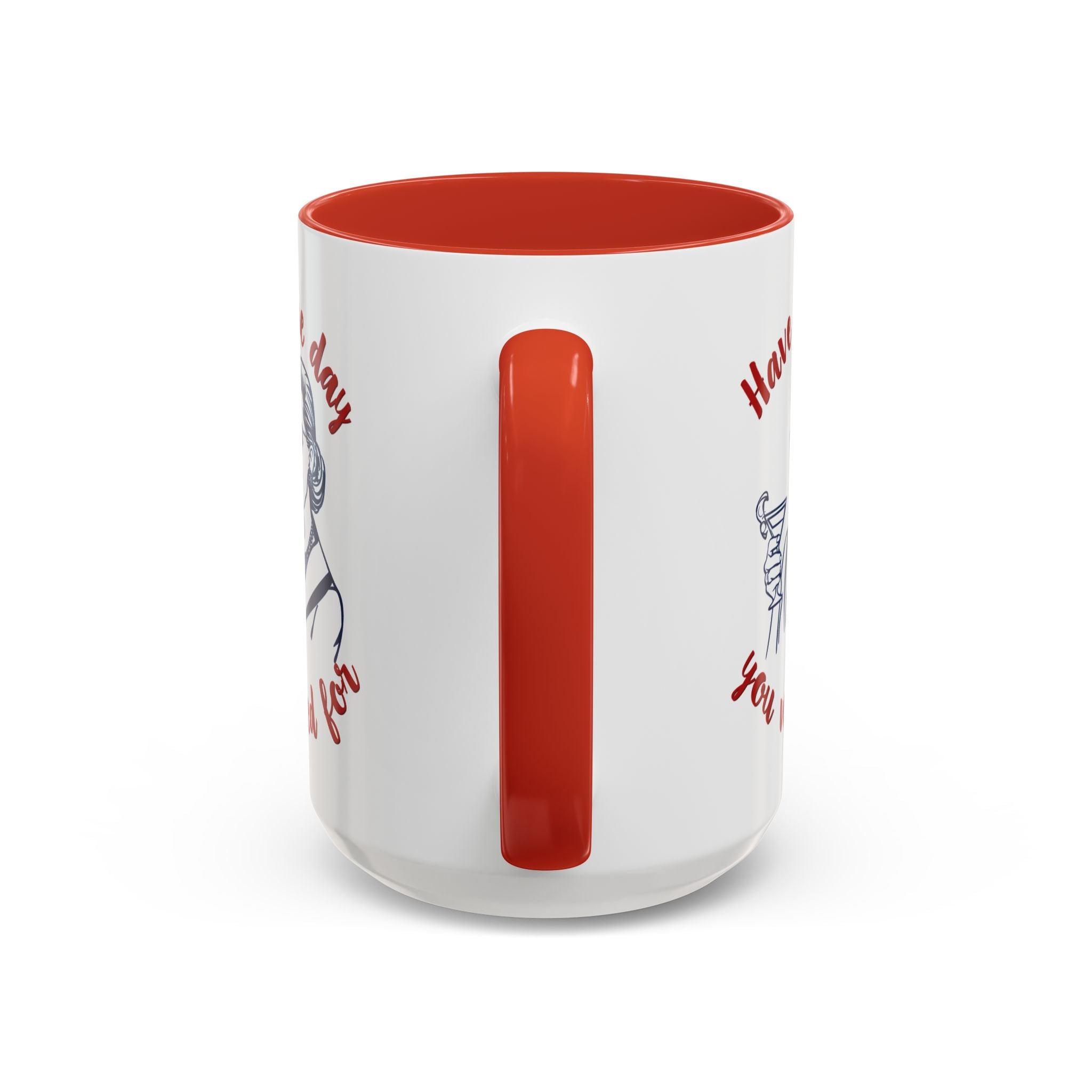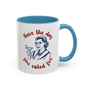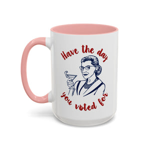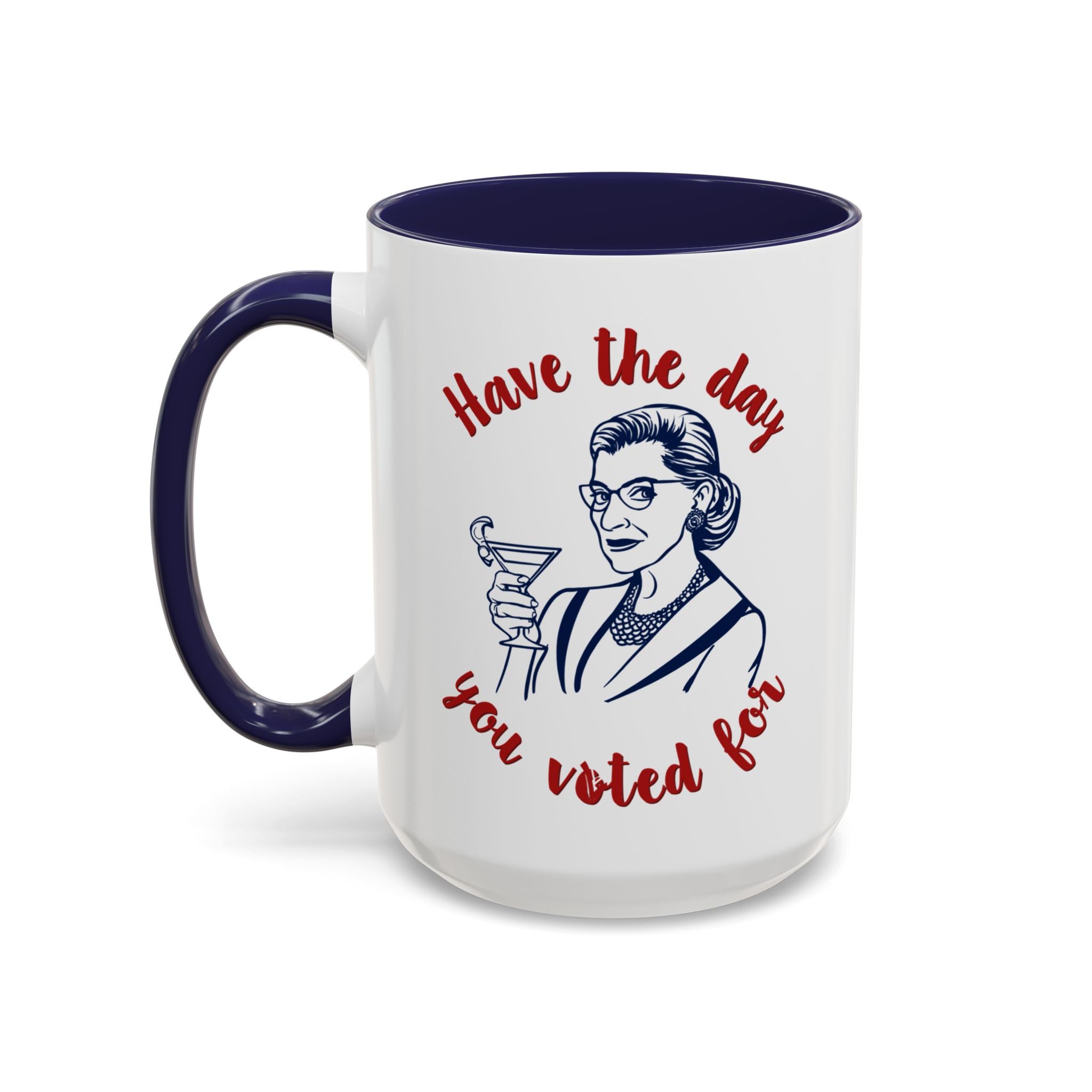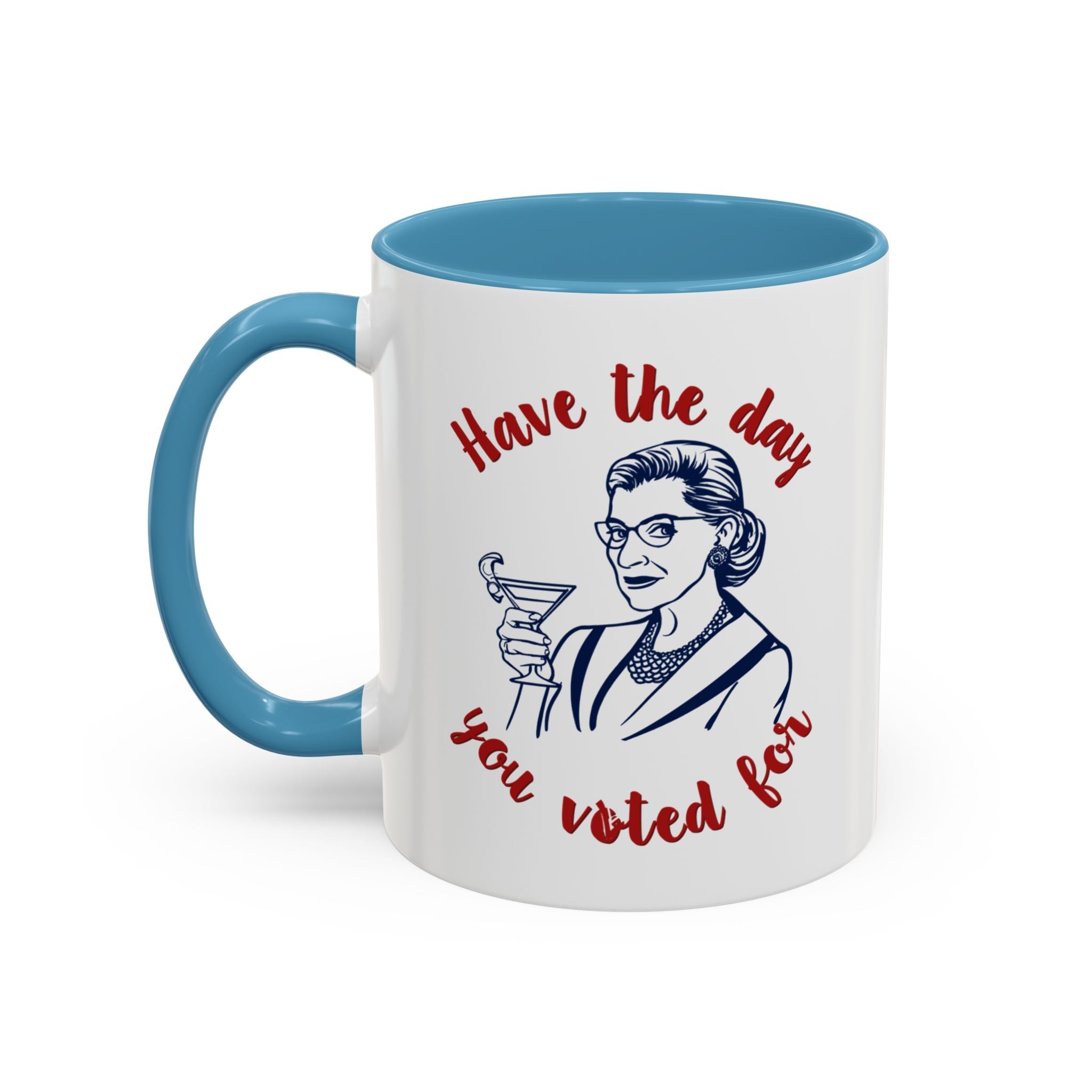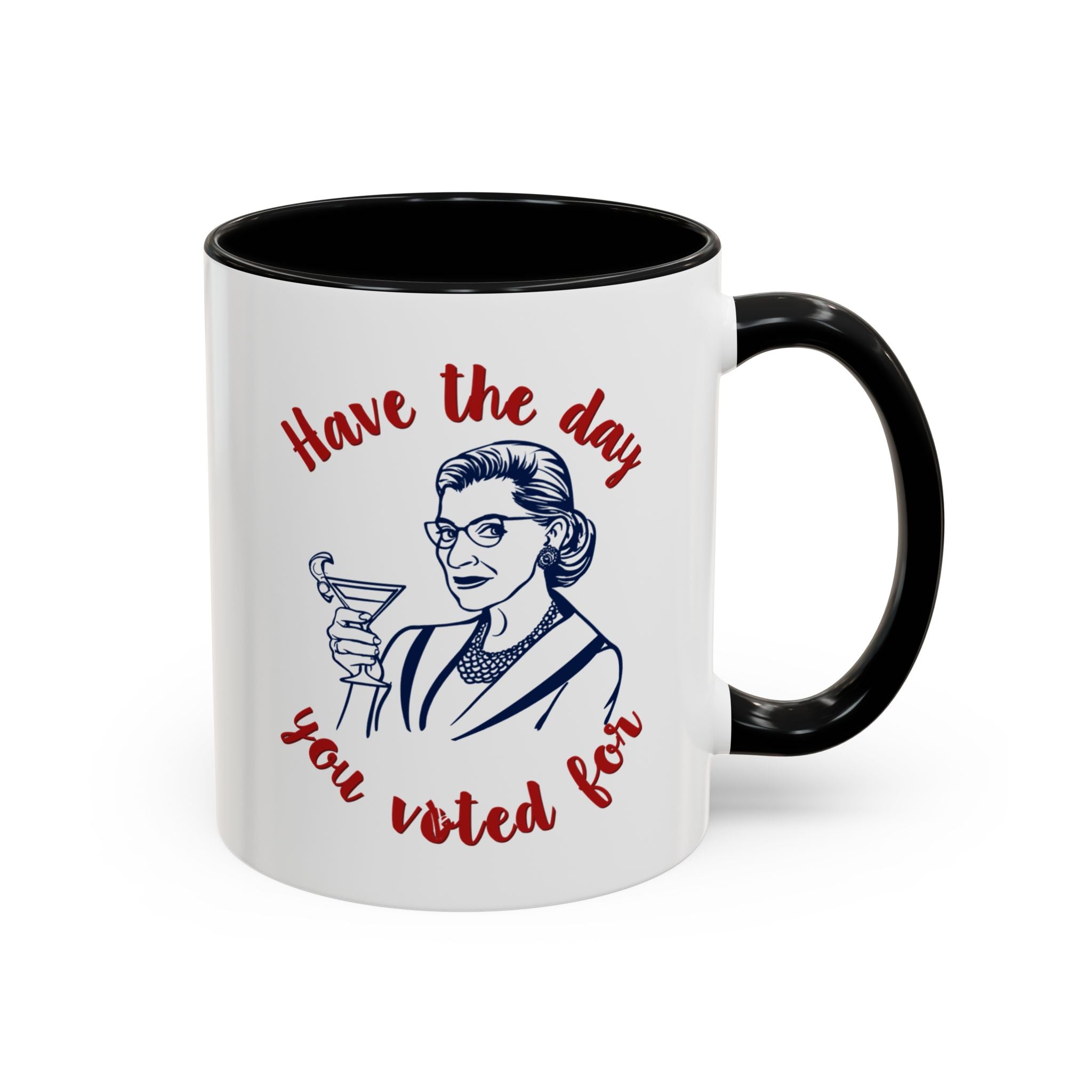 Start your morning with bold energy and a touch of wit with this “Have The Day You Voted For” accent mug. Featuring an illustration of Ruth Bader Ginsburg raising a cocktail, this red-handled and red-rimmed mug makes a perfect statement piece. The empowering design combines humor and politics, making it an ideal gift for feminists, activists, and coffee lovers who want their drinkware to inspire conversation. Perfect for coffee, tea, or any favorite beverage, this mug adds personality and power to every sip.