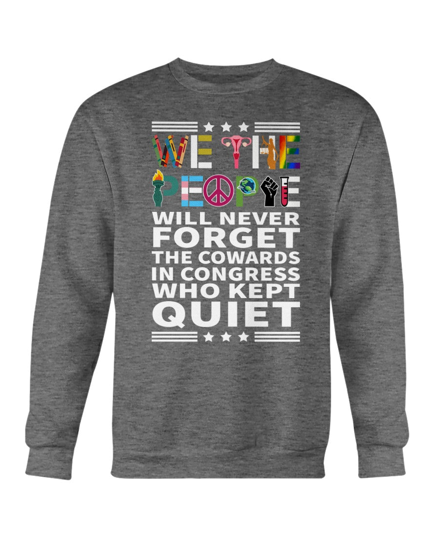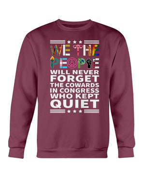 This powerful shirt features the bold statement: “WE THE PEOPLE WILL NEVER FORGET THE COWARDS IN CONGRESS WHO KEPT QUIET.” The words We The People are designed with colorful symbols of equality, peace, and justice, making the message stand out even more. A striking design for activists, feminists, and those who value accountability in leadership. Perfect for rallies, everyday wear, or as a gift for strong voices who believe in democracy and justice.