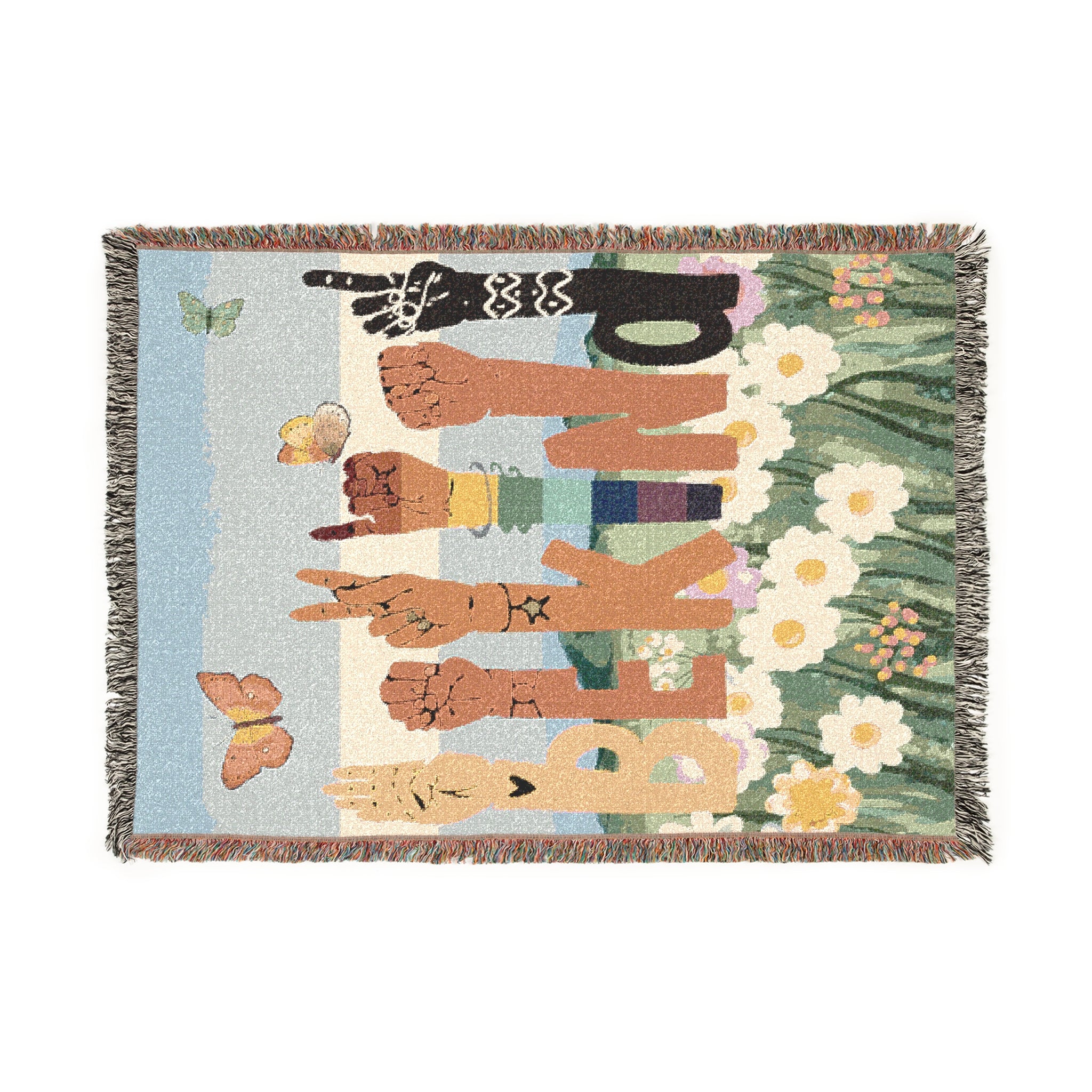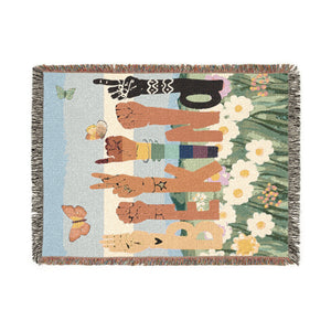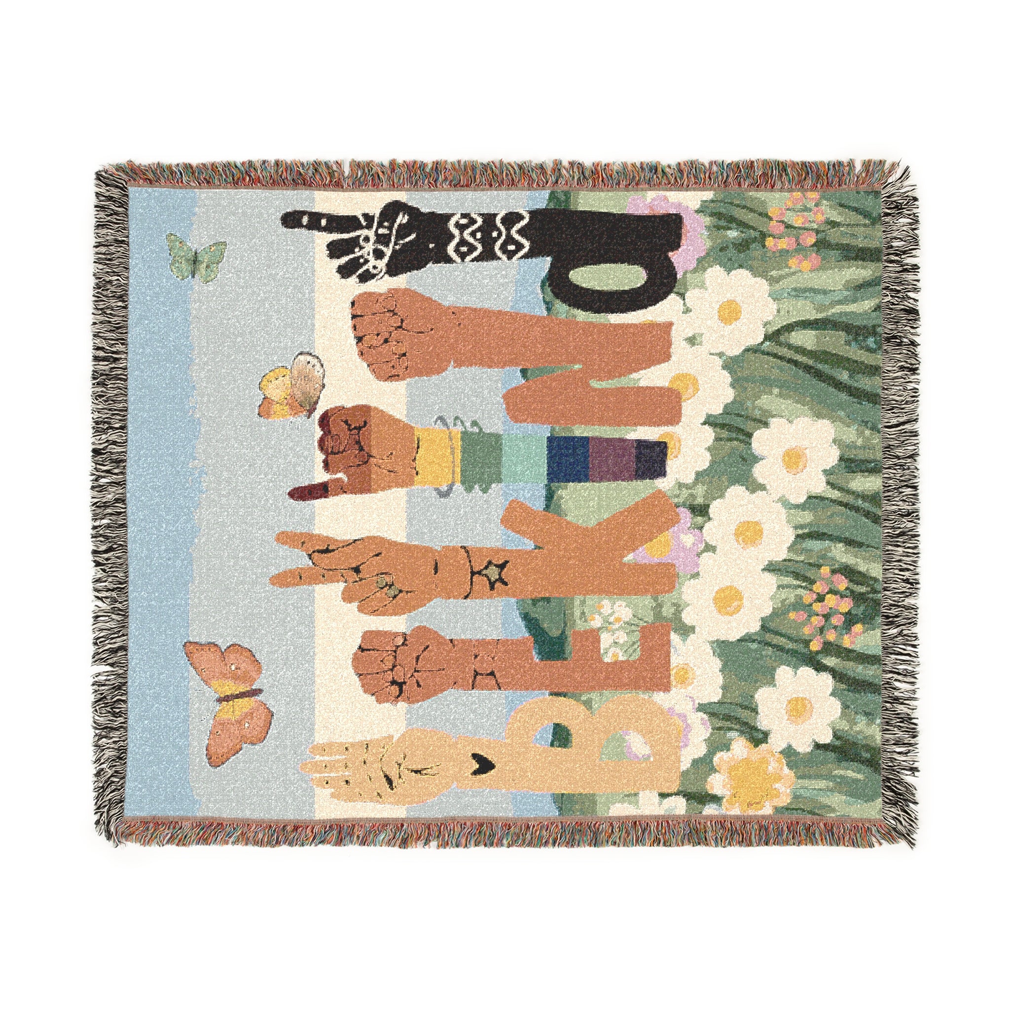 This woven blanket features raised hands of different skin tones forming the message "BE KIND"—a beautiful reminder of unity, diversity, and compassion. Surrounded by butterflies and blooming flowers, it brings warmth and positivity to any space. Made from soft, breathable woven cotton, it’s perfect for cozy evenings, mindful home décor, or as a heartfelt gift that spreads kindness.