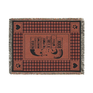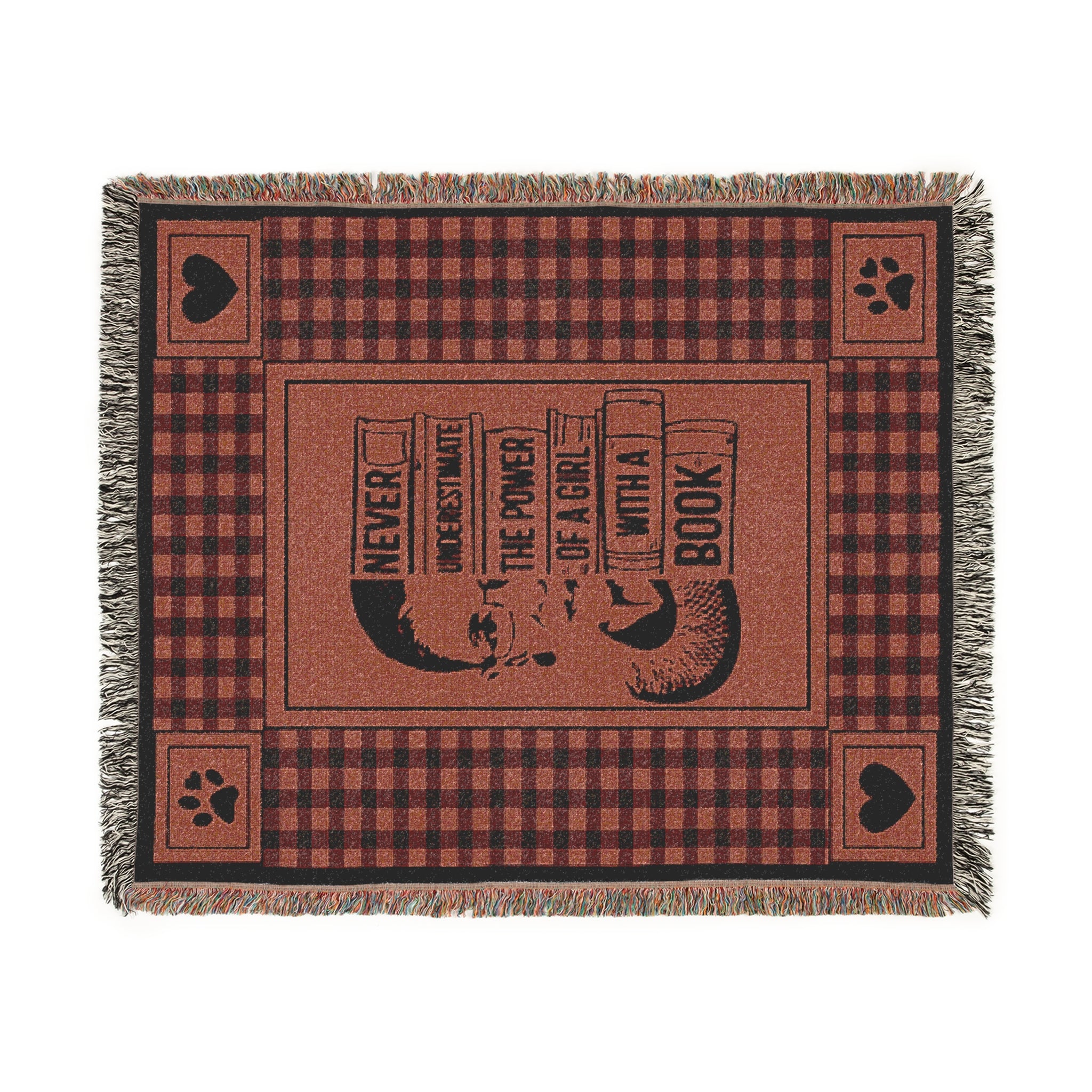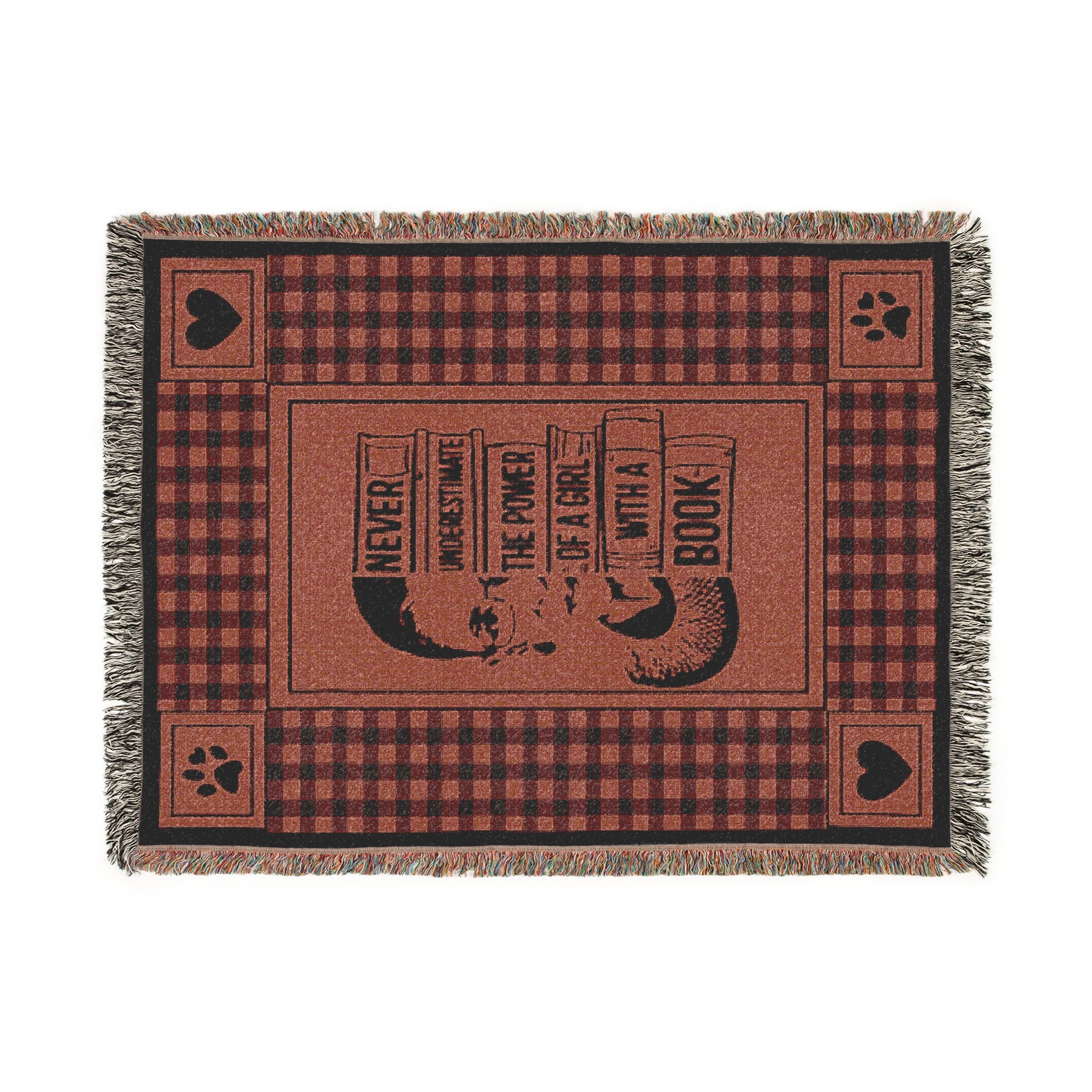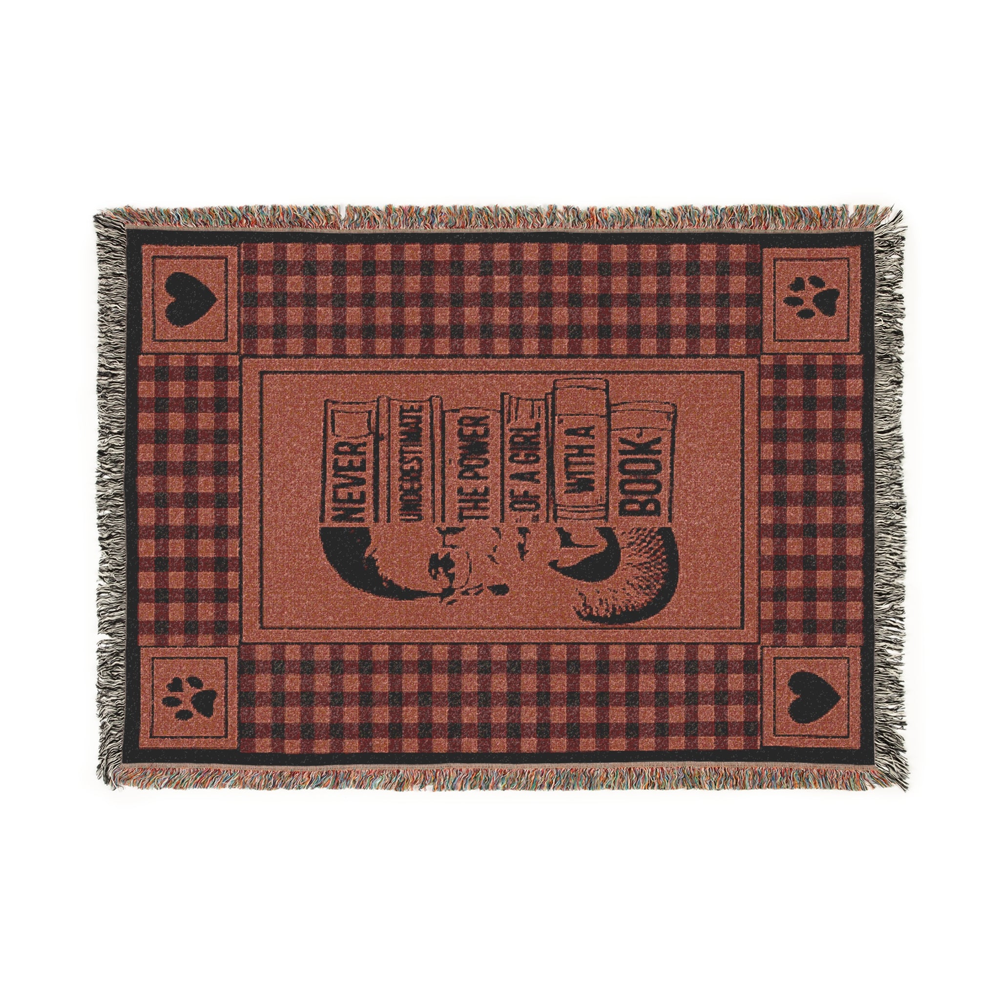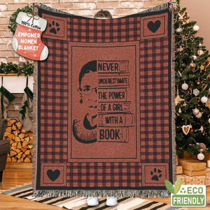 This woven blanket features a bold tribute to Ruth Bader Ginsburg with the empowering quote “Never Underestimate The Power Of A Girl With A Book.” Designed in a cozy plaid pattern with heart and paw–corner accents, it blends warmth, comfort, and feminist inspiration. Made from eco-friendly 100% cotton, this soft throw is perfect for book lovers, reading nooks, libraries, and meaningful gifts that celebrate women’s strength, education, and voice.