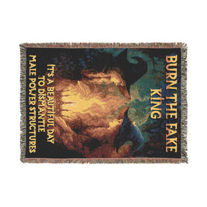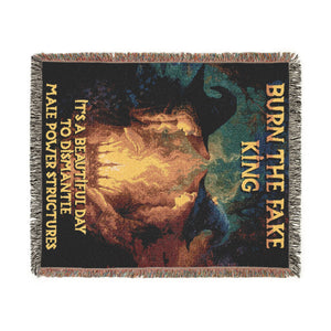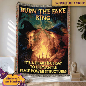 This Burn The Fake King Woven Blanket features a bold witchcraft-inspired illustration of two witches gathered around a glowing fire. The woven design displays powerful text: “BURN THE FAKE KING” and “It’s a beautiful day to dismantle male power structures.” Perfect for women who believe in empowerment, equality, and reclaiming their voice. Ideal as cozy home décor for bedrooms, reading nooks, and ritual spaces. Made for feminists, modern witches, and anyone who loves strong imagery and symbolic storytelling.