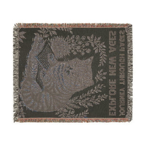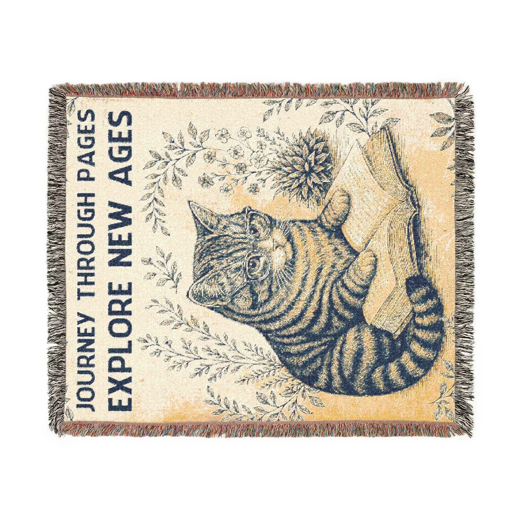 This Journey Through Pages Cat Woven Blanket features an adorable tabby cat wearing glasses, peacefully reading atop an open book, surrounded by delicate botanical art. The design includes the inspiring text “JOURNEY THROUGH PAGES – EXPLORE NEW AGES,” celebrating the magic of reading and curiosity. Crafted with soft woven cotton and finished with classic fringe edges, this cozy throw is perfect for book lovers, cat enthusiasts, library décor, and warm reading corners. A thoughtful and meaningful gift for anyone who finds comfort in stories and whiskered companionship.