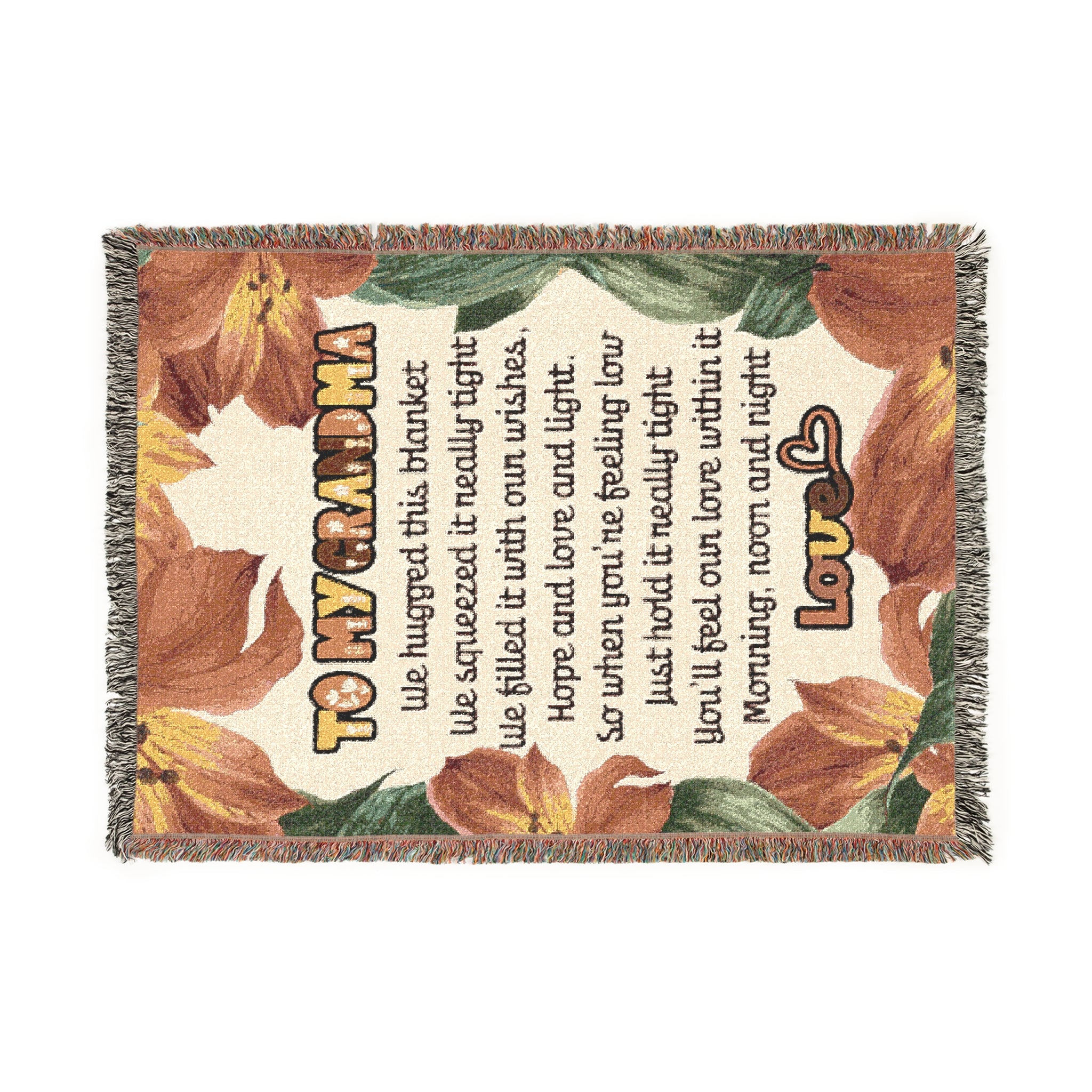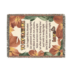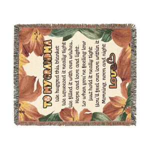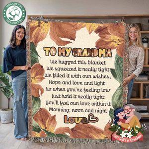 Wrap your grandmother in warmth, love, and heartfelt appreciation with this beautifully designed woven blanket. The design features the text "To My Grandma" along with a touching poem about love, comfort, and emotional support. Surrounded by soft floral artwork, this 100% cotton throw makes a meaningful gift that reminds her she’s cherished—morning, noon, and night. Perfect for birthdays, Christmas, Mother’s Day, or simply to say “I love you.”
