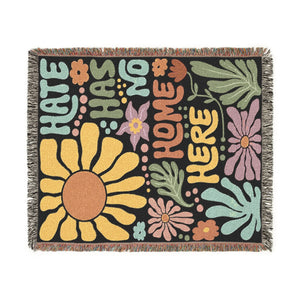 This uplifting woven blanket features the bold, positive message “Hate Has No Home Here” surrounded by warm, colorful floral and sun illustrations. Made from soft, durable woven cotton, it brings a welcoming and inclusive spirit to any living room, reading nook, or outdoor space. Perfect as a housewarming gift, a cozy reminder of kindness, or a statement piece that reflects your values of love and acceptance.