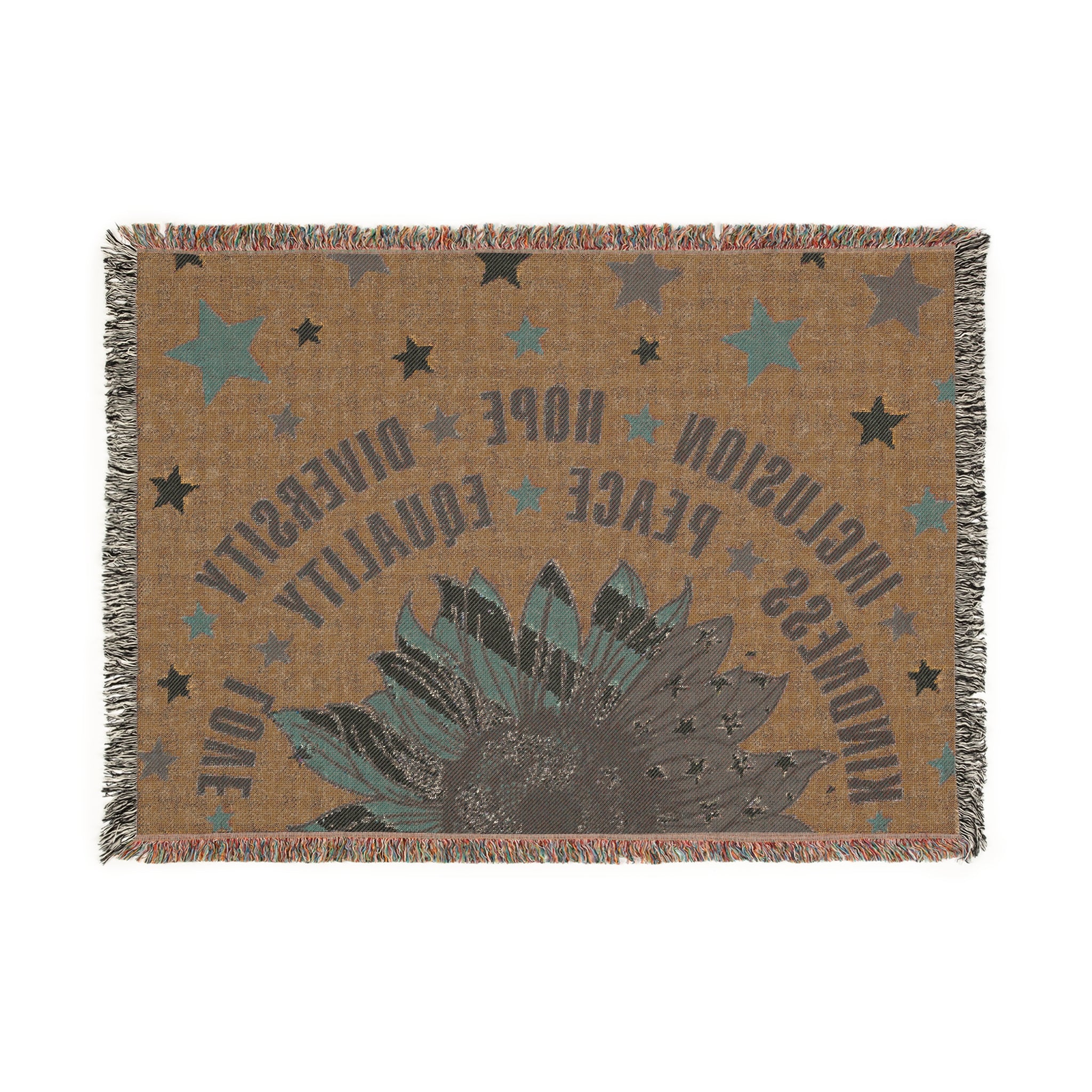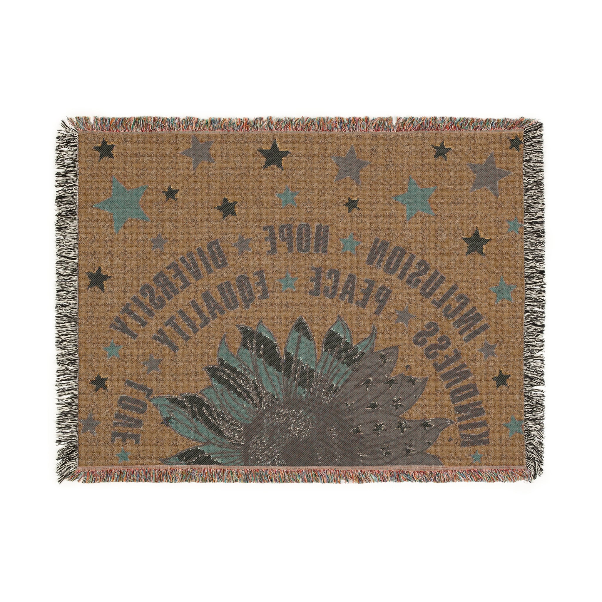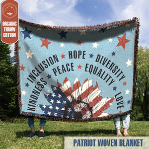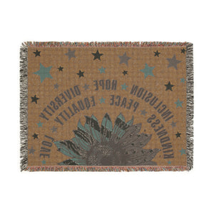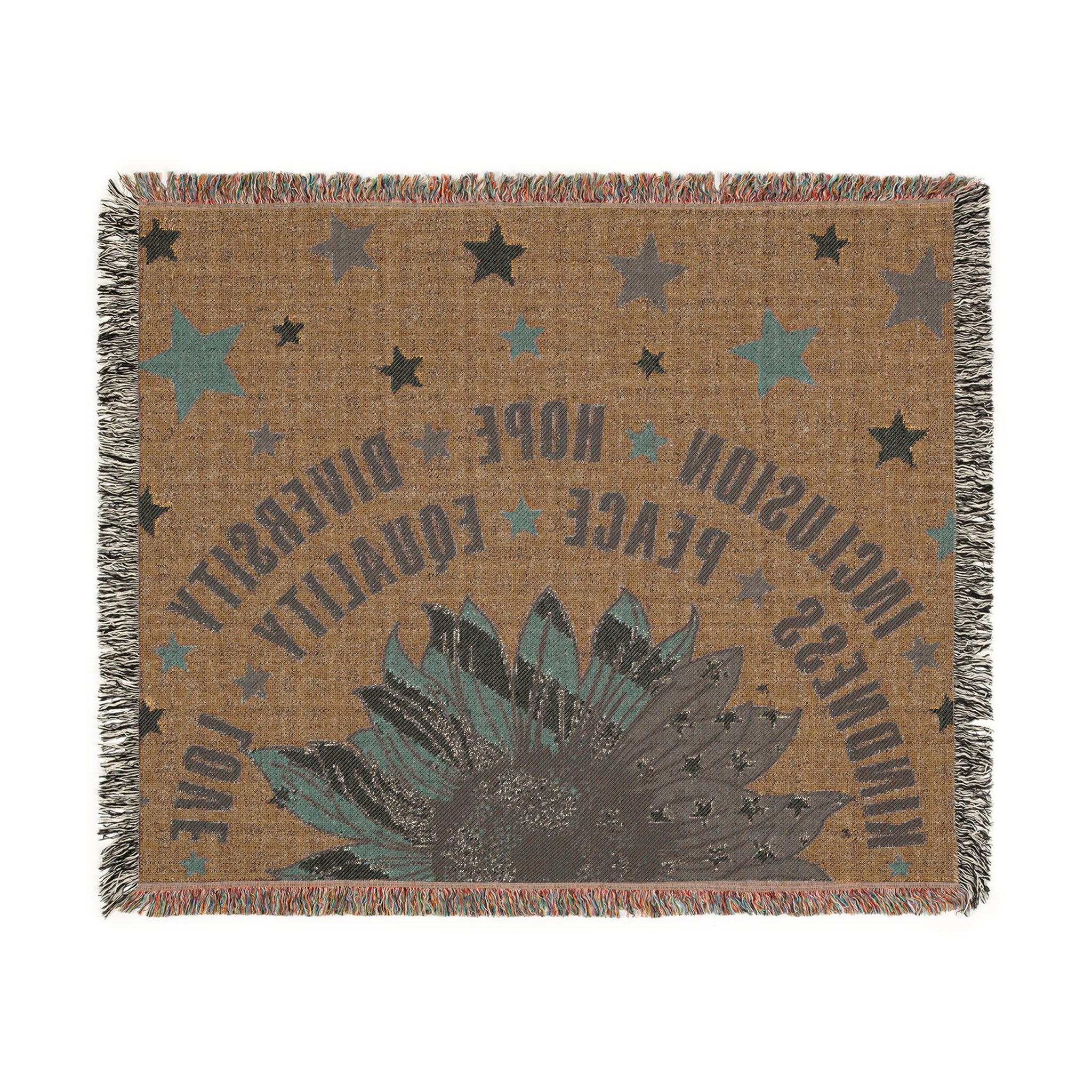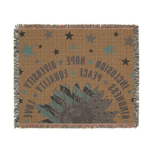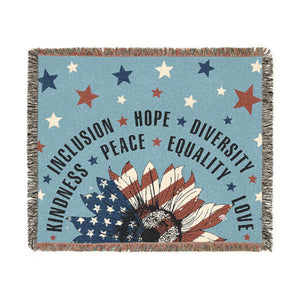 Celebrate unity and compassion with this beautifully crafted woven blanket featuring an American flag sunflower surrounded by uplifting words: Inclusion, Hope, Diversity, Kindness, Peace, Equality, Love. Made from soft organic cotton, it’s a meaningful home accent that promotes togetherness and positive values. Perfect for picnics, couch cuddles, and as a thoughtful gift for those who believe in a kinder, more inclusive America.