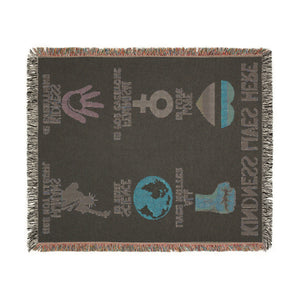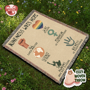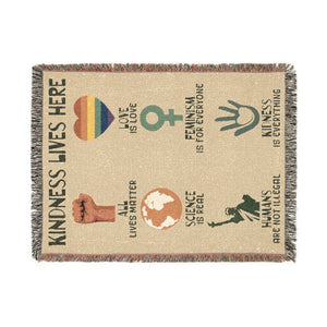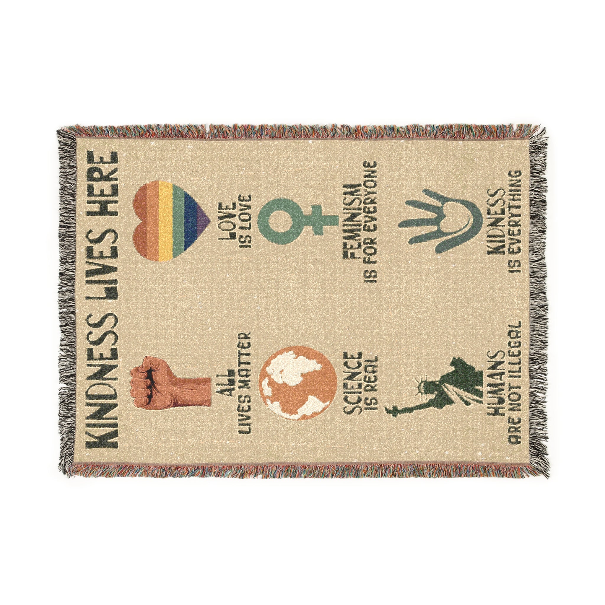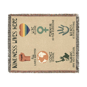 Wrap your home in compassion and inclusivity with this meaningful woven throw. The design features bold, uplifting statements: "Kindness Lives Here," "Love Is Love," "Feminism Is For Everyone," "All Lives Matter," "Science Is Real," "Humans Are Not Illegal," and "Kindness Is Everything," alongside symbolic icons for equality, unity, and love. Made from soft woven cotton, this blanket is perfect for cozy spaces, reading corners, or gifting to someone who believes in a better, kinder world.