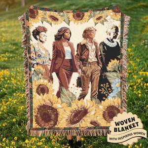 Celebrate the legacy of trailblazing women with this beautifully illustrated woven blanket featuring Frida Kahlo, Michelle Obama, Amelia Earhart, and Ruth Bader Ginsburg. Surrounded by vibrant sunflowers and wildflowers, these iconic figures stand tall in a stunning tapestry-style design that radiates strength, courage, and empowerment. Made with high-quality woven fabric and fringed edges, this blanket is both a cozy keepsake and a bold statement of admiration for women who changed the world.