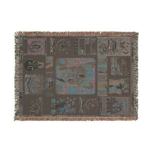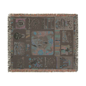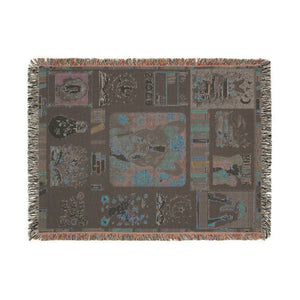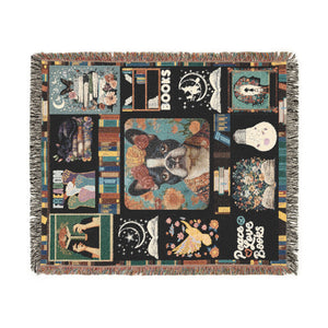 This artistic woven blanket features a charming Boston terrier framed by books, flowers, and symbols of knowledge and empowerment. The vibrant patchwork design highlights themes like peace, love, reading, and resistance—perfect for book lovers, dog moms, and justice seekers alike.