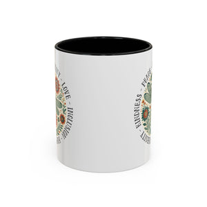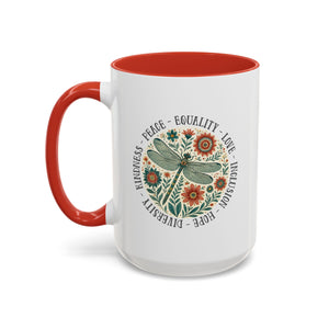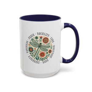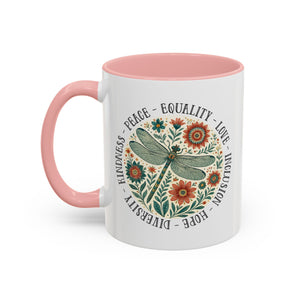 This accent mug features a beautiful dragonfly surrounded by floral art and inspiring words: “KINDNESS – PEACE – EQUALITY – LOVE – INCLUSION – HOPE – DIVERSITY.” With its black handle and interior, this mug combines elegance with a powerful message of unity and compassion. Perfect for daily use, it makes a thoughtful gift for women, feminists, activists, and anyone who believes in spreading kindness and equality.