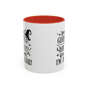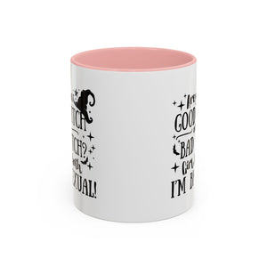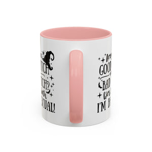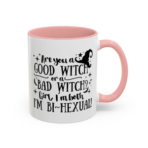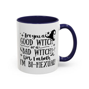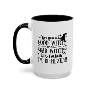 Celebrate your spellbinding spirit and LGBTQ+ pride with this bold and playful accent mug! Featuring the phrase "Are you a good witch or a bad witch? Girl, I'm both. I'm bi-hexual!" in a whimsical font surrounded by stars, bats, and a witch hat — this design is perfect for witches of all kinds. The high-quality ceramic mug has a sleek black handle and inner rim, making it a magical gift for Halloween, Pride, or any time you want to stir up some fun.