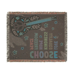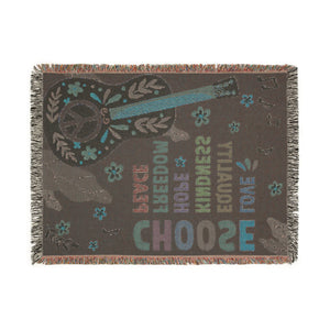 Wrap yourself in the warmth of values that matter. This beautifully crafted woven blanket features bold retro-style typography and a peace guitar illustration alongside inspiring words like Love, Equality, Kindness, Hope, Freedom, and Peace. A perfect blend of comfort and message, it’s ideal for cozying up at home or displaying as a statement piece that reflects your beliefs. Made with high-quality woven fabric and fringe edges, it brings a touch of bohemian charm and a powerful voice to any space.
