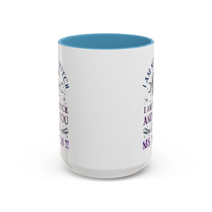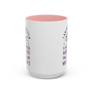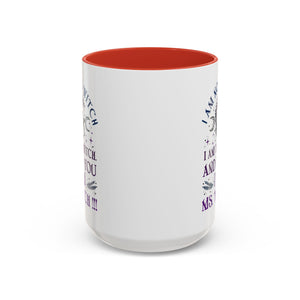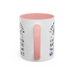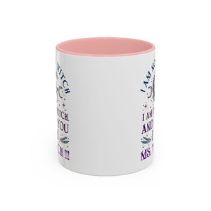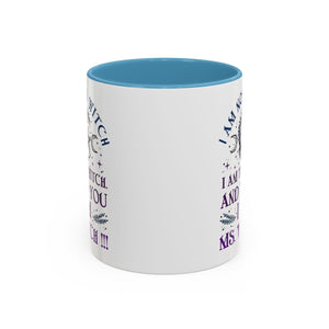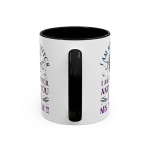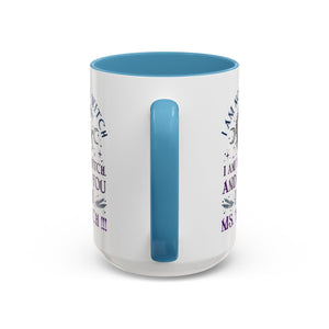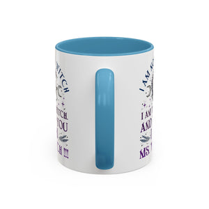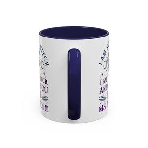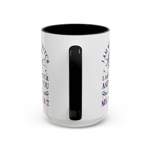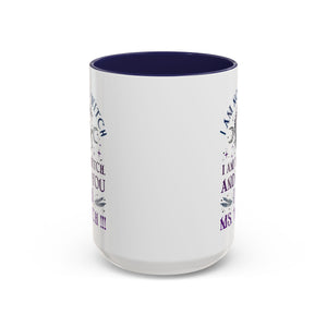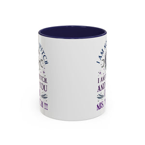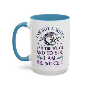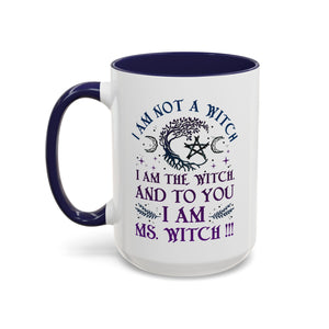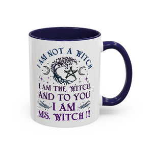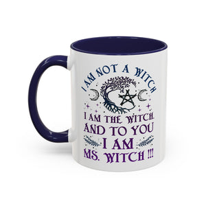 Start your mornings with a bold dose of magic and empowerment! This enchanting accent mug features a mystical design with celestial symbols, a twisted tree of life, pentacle, crescent moons, and a powerful message that reads: “I am not a witch. I am the witch. And to you I am Ms. Witch!!!” — all printed in striking purple and midnight blue tones. Perfect for witches, feminists, and lovers of spiritual sass, this mug makes a statement with every sip. Durable, high-quality ceramic with a contrasting black handle and interior adds a sleek, modern touch to your daily brew.