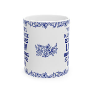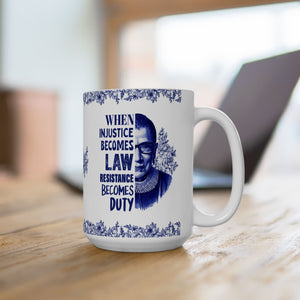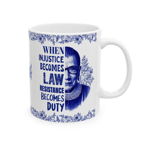 Stand for justice every morning with this ceramic mug featuring the bold Ruth Bader Ginsburg design and the powerful quote: “When injustice becomes law, resistance becomes duty.” The deep blue artwork combines floral accents with a striking portrait of RBG, making it both inspirational and stylish. Perfect for coffee, tea, or hot cocoa, this mug is a daily reminder of courage and equality. Microwave and dishwasher safe, it’s an ideal gift for feminists, activists, and RBG admirers.