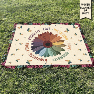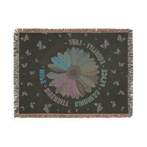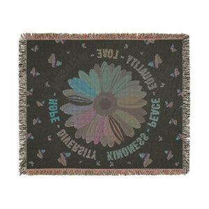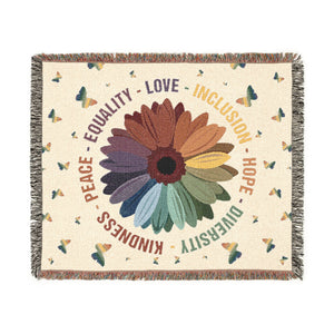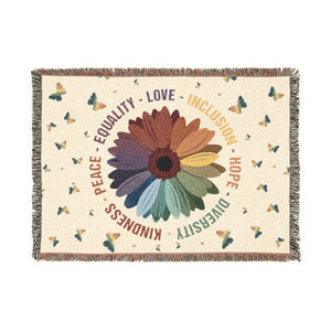 This vibrant woven blanket features a multicolor daisy at the center, surrounded by butterflies and powerful words: Peace, Equality, Love, Inclusion, Hope, Diversity, Kindness. A cozy and meaningful design that promotes unity and compassion.