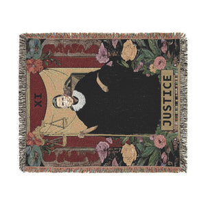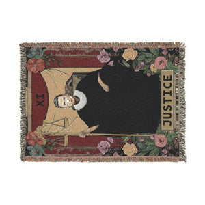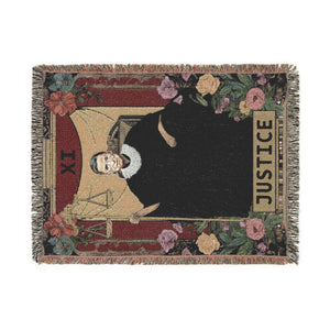 Wrap yourself in powerful symbolism and iconic strength with this RBG Justice Woven Blanket. Featuring a striking portrait of Ruth Bader Ginsburg seated in a judicial frame inspired by tarot art, surrounded by floral motifs and the symbol of balanced scales, this design celebrates justice, dignity, and feminine power. Woven with care and detail, it’s perfect for cozying up with purpose or gifting to someone who cherishes equality and empowerment.