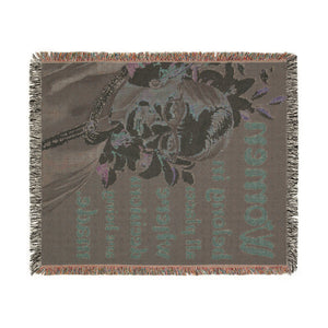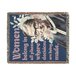 Celebrate the legacy of Ruth Bader Ginsburg with this empowering woven blanket featuring her iconic portrait and the quote “Women belong in all places where decisions are being made.” Surrounded by soft floral elements on a bold navy background, this design inspires strength, justice, and equality.