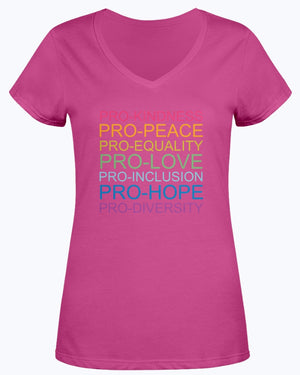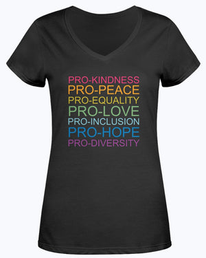 Pro-kindness Pro-peace Pro-equality Pro-love Pro-inclusion Pro-hope Pro-Diversity Shirt. Make a bold statement for unity and acceptance with this powerful message t-shirt. Featuring a striking rainbow gradient text design on a classic black background, this shirt proudly displays progressive values including kindness, peace, equality, love, inclusion, hope, and diversity. The clean, modern typography creates an eye-catching look that sparks meaningful conversations. This comfortable unisex t-shirt is perfect for rallies, community events, or everyday wear to show your support for social justice and human rights. The durable cotton blend material maintains its shape and vibrant colors through multiple washes. The versatile crew neck design and standard fit make it suitable for all body types. Wear your values and inspire positive change with this meaningful piece of apparel.