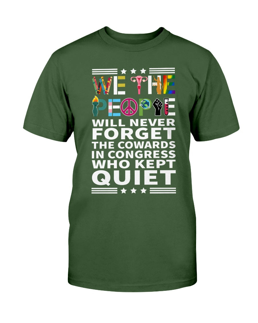 This powerful shirt features the bold statement: “WE THE PEOPLE WILL NEVER FORGET THE COWARDS IN CONGRESS WHO KEPT QUIET.” The words We The People are designed with colorful symbols of equality, peace, and justice, making the message stand out even more. A striking design for activists, feminists, and those who value accountability in leadership. Perfect for rallies, everyday wear, or as a gift for strong voices who believe in democracy and justice.
