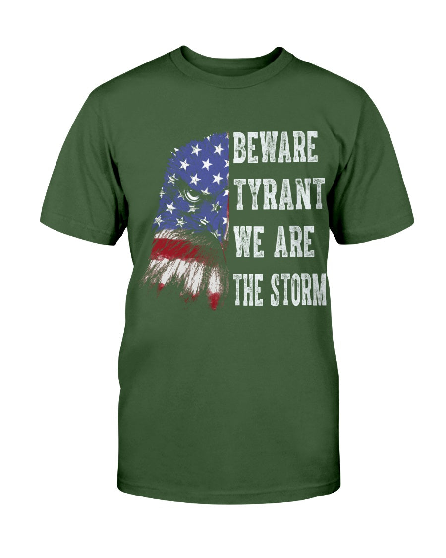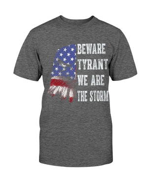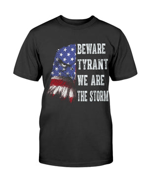 This shirt features a fierce eagle design blended with the American flag, paired with the powerful text: “BEWARE TYRANT WE ARE THE STORM.” A bold patriotic and activist statement, this shirt is perfect for those who stand against oppression and fight for freedom. Ideal for rallies, protests, or everyday wear, it symbolizes strength, unity, and resilience. A great gift for strong voices who believe in justice and democracy.
