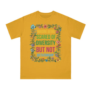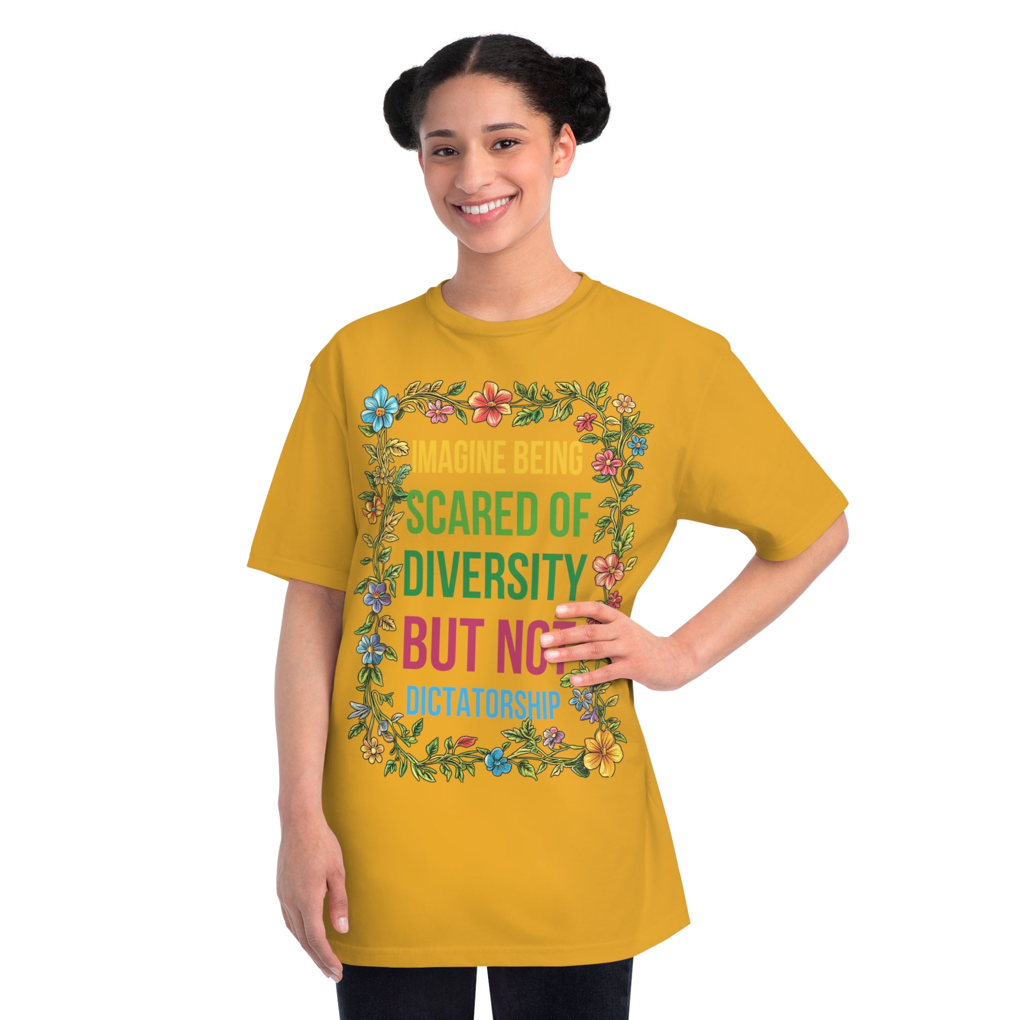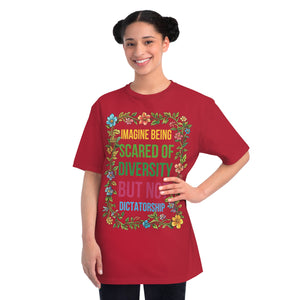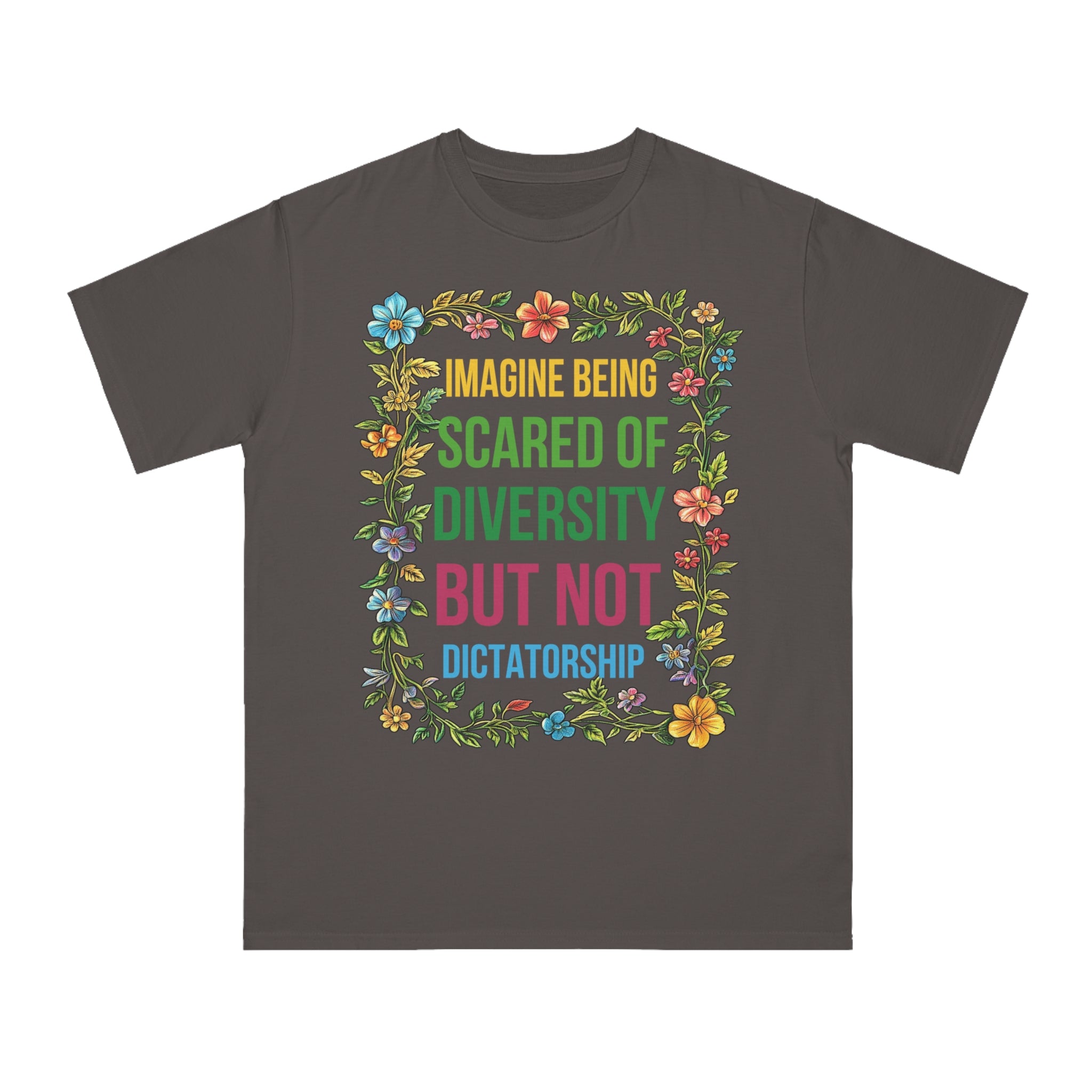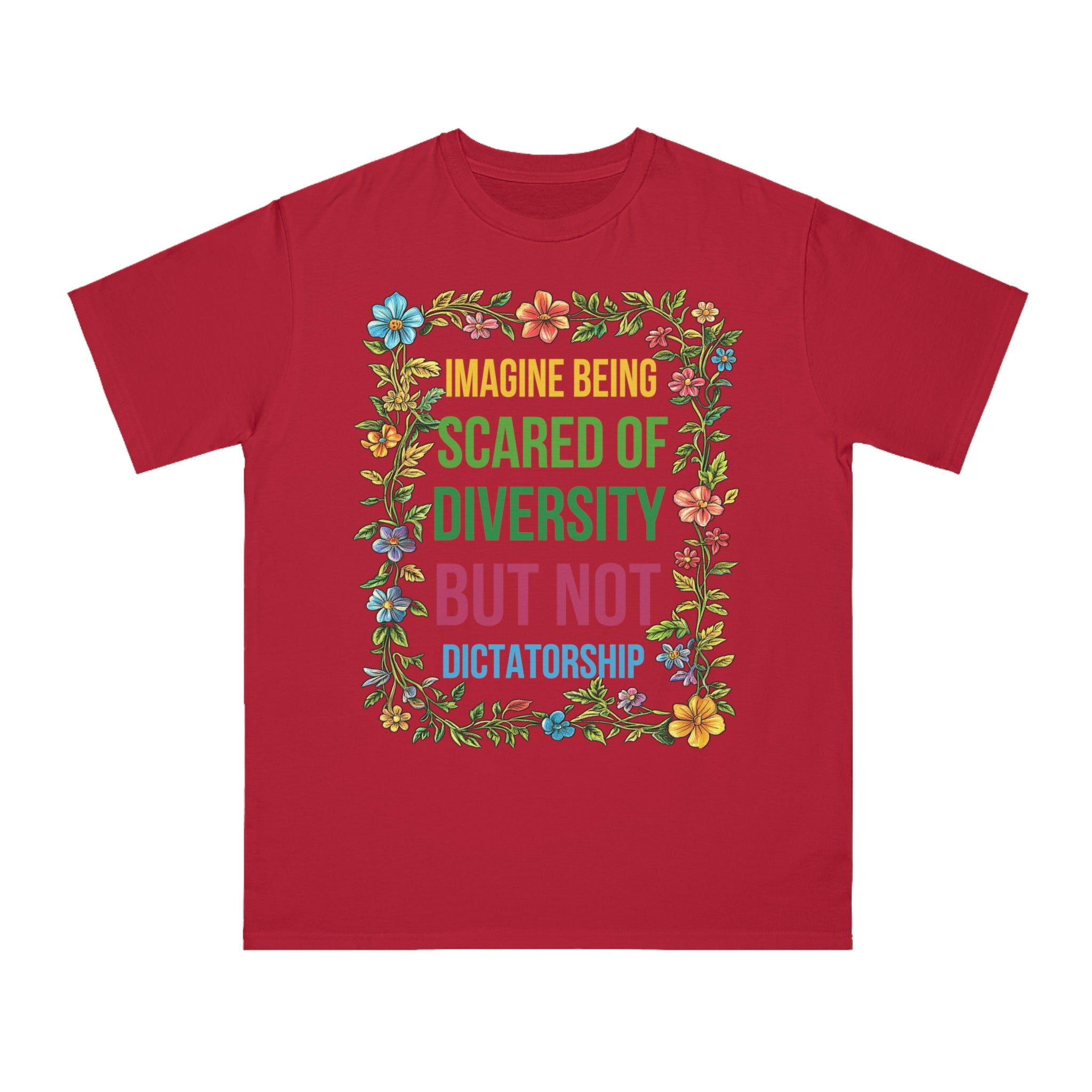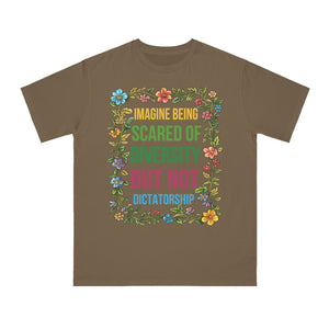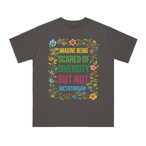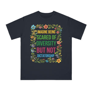 Make a bold statement for justice and inclusion with this Imagine Being Scared Of Diversity Organic T-Shirt. The design features the powerful quote “IMAGINE BEING SCARED OF DIVERSITY BUT NOT DICTATORSHIP” surrounded by a vibrant floral frame — a perfect contrast between beauty, courage, and truth. Crafted from 100% certified organic cotton, this eco-friendly tee is soft, breathable, and ethically made. Ideal for activists, feminists, and equality advocates, it’s not just apparel — it’s a message of empowerment and awareness. Wear it proudly to show that compassion and diversity are stronger than fear.