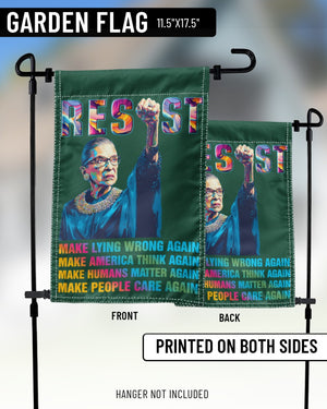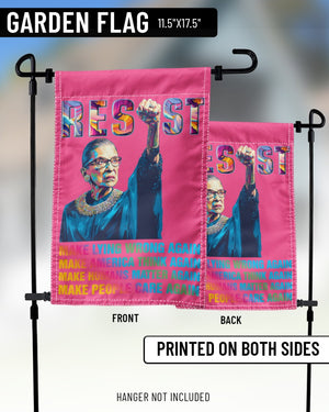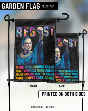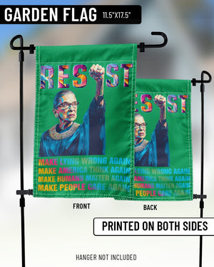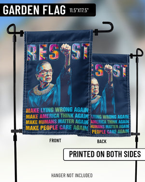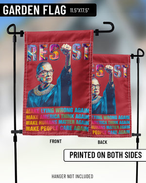 This powerful garden flag features Ruth Bader Ginsburg with a raised fist and the bold word “RESIST.” Below her portrait, the design carries strong messages in colorful text: “MAKE LYING WRONG AGAIN, MAKE AMERICA THINK AGAIN, MAKE HUMANS MATTER AGAIN, MAKE PEOPLE CARE AGAIN.” Perfect for feminists, activists, and supporters of justice, this flag makes a striking statement in any yard or garden. A meaningful way to honor RBG’s legacy and inspire change.