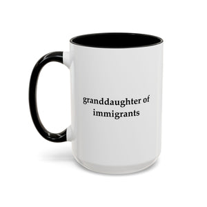 Celebrate your proud heritage with our "Granddaughter of Immigrants" mug. This elegant white mug with a vibrant red interior and handle adds a splash of color to your morning routine while displaying a powerful message. It’s a perfect way to honor your family's journey and a great gift for anyone proud of their immigrant roots. Whether you're sipping your morning coffee or tea, this mug serves as a daily reminder of where you come from and the diversity that strengthens our communities.