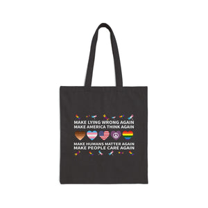 Smart, bold, and full of heart—this tote bag carries a message that truly matters. Featuring colorful heart icons representing inclusivity, peace, and pride, the design is paired with powerful statements: “Make Lying Wrong Again,” “Make America Think Again,” “Make Humans Matter Again,” and “Make People Care Again.” Surrounded by playful dragonflies, this tote is a vibrant reminder of empathy and awareness. Perfect for everyday use, protests, bookstores, or as a gift for progressive thinkers.