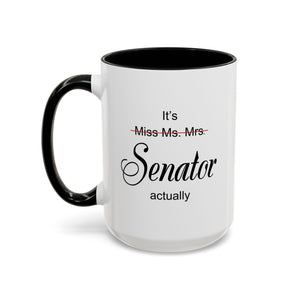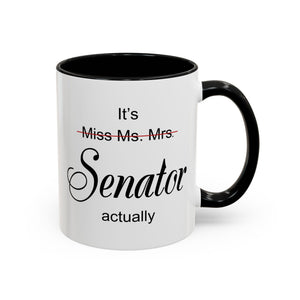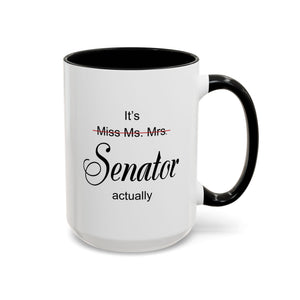 Make a bold statement with this empowering feminist mug! Featuring the phrase "It's Senator Actually" with "Miss, Ms., Mrs." crossed out, this mug is perfect for women breaking barriers and defying expectations. Whether you're a senator, a leader, or simply a woman who refuses to be defined by traditional titles, this mug is a daily reminder of strength and ambition. Ideal for political enthusiasts, feminists, and powerful women everywhere.