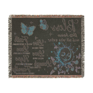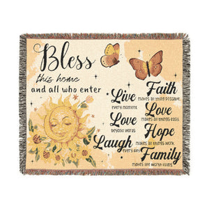 A warm, woven (not printed) tapestry blanket designed with a radiant sun, butterflies, and uplifting blessings. The blanket features the heartfelt text: “Bless this home and all who enter — Live every moment, Love beyond words, Laugh every day, Faith makes all things possible, Love makes all things easy, Hope makes all things work, Family makes life worth living.”