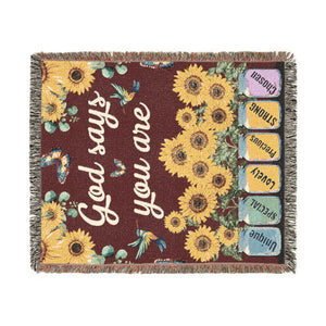 A faith-filled woven blanket designed to uplift your heart with every word. The design features the comforting message “God says you are” surrounded by sunflowers, butterflies, and jars labeled Unique, Special, Lovely, Precious, Strong, Chosen. Made from premium woven cotton — not printed — this blanket brings warmth, encouragement, and God’s love into any home. A perfect inspirational gift for women who cherish faith, hope, and daily reminders of their worth.