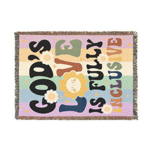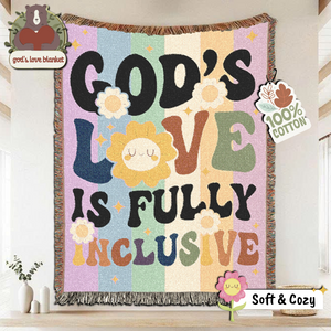 This 100% cotton woven—not printed—blanket features a soft pastel rainbow background with bold, uplifting text that reads: “God’s Love Is Fully Inclusive.” Adorned with cheerful flower illustrations and cozy textures, it’s a heartwarming reminder of unconditional love and acceptance. Perfect for faith-filled homes, comforting gifts, and anyone who believes love embraces everyone.