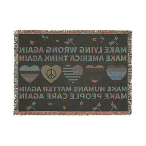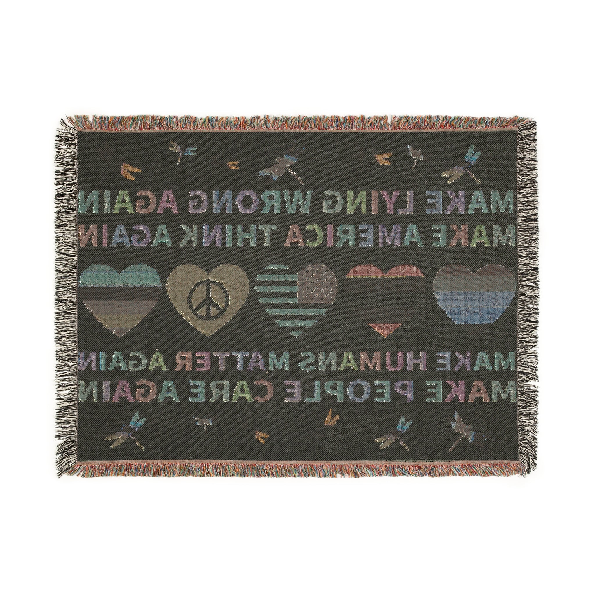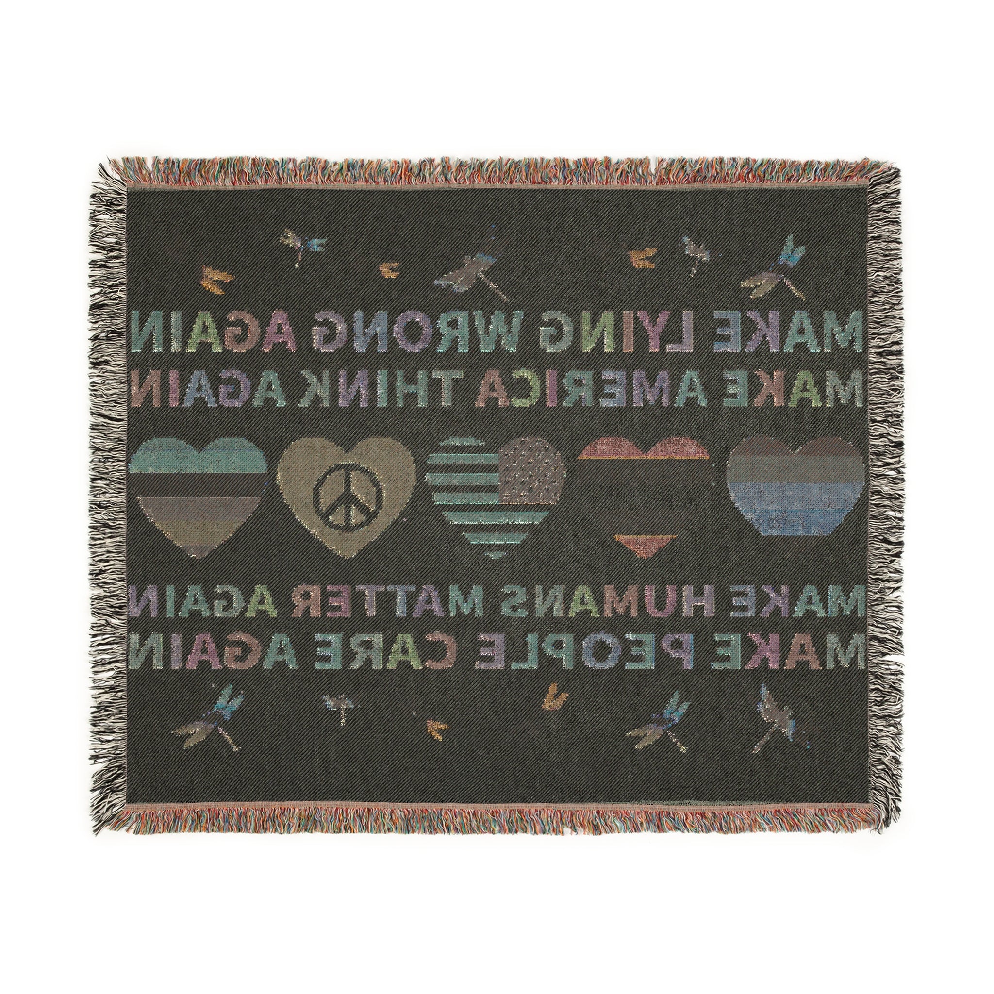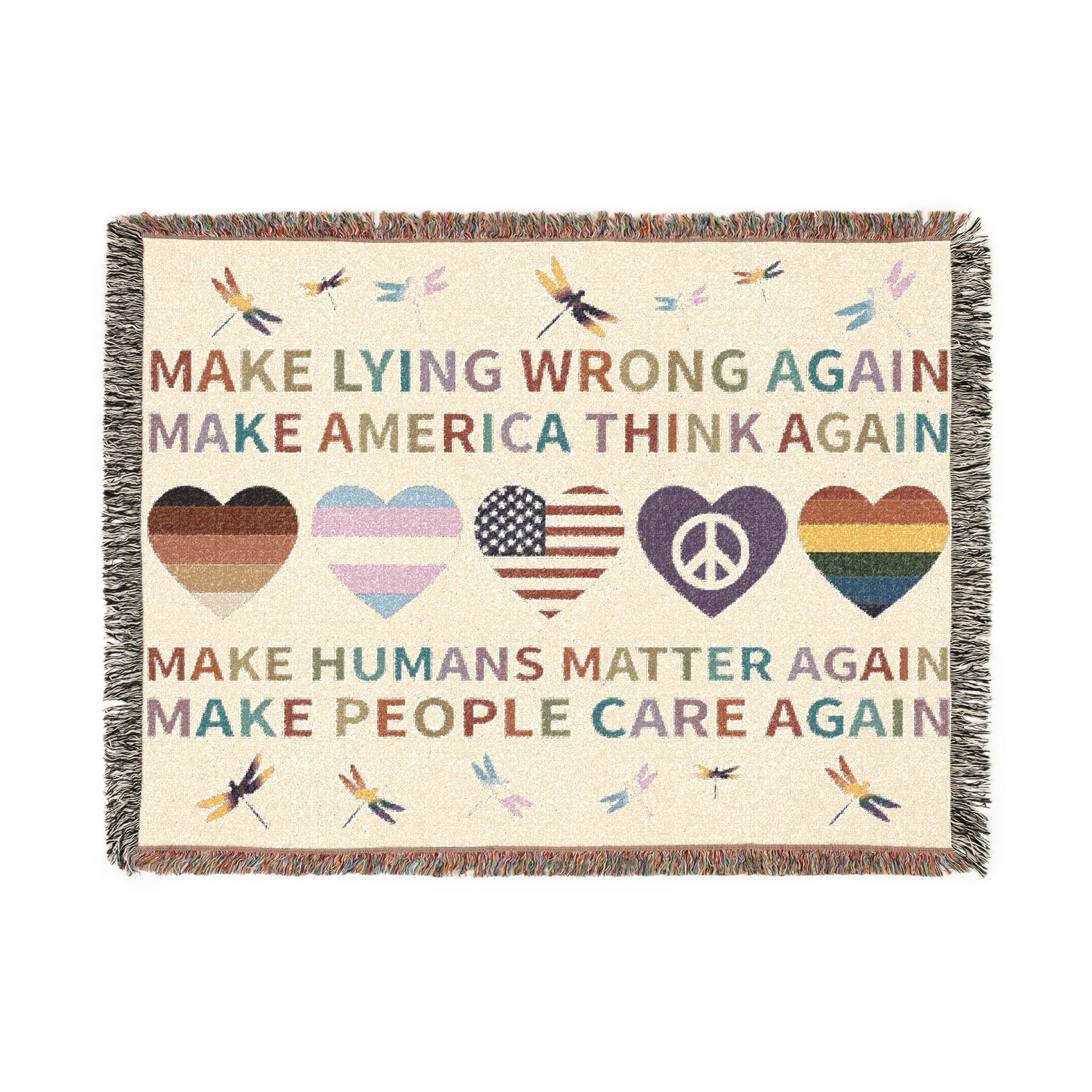 This vibrant woven blanket features a powerful and heartfelt message: “Make Lying Wrong Again, Make America Think Again, Make Humans Matter Again, Make People Care Again.” Adorned with rainbow-toned hearts, peace symbols, and dragonflies, it celebrates truth, empathy, unity, and pride. A cozy and meaningful piece for those who believe in justice, inclusion, and hope.