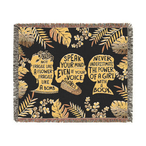 This woven—not printed—blanket honors generations of courageous women with three powerful messages: “Not fragile like a flower, fragile like a bomb,” “Speak your mind even if your voice shakes,” and “Never underestimate the power of a girl with a book.”
