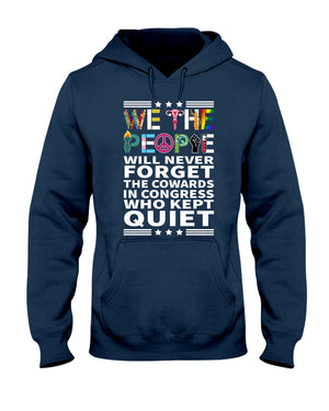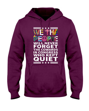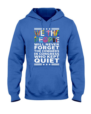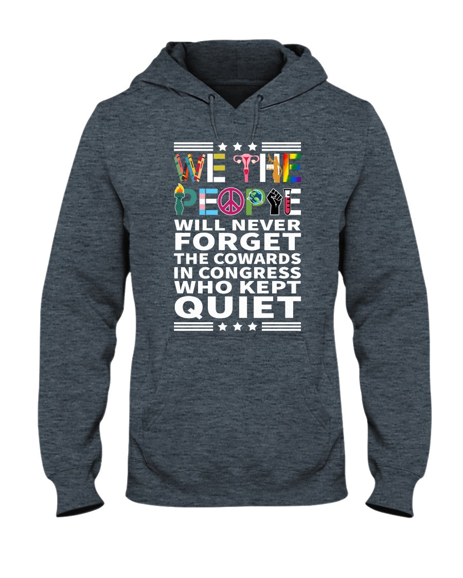 This powerful shirt features the bold statement: “WE THE PEOPLE WILL NEVER FORGET THE COWARDS IN CONGRESS WHO KEPT QUIET.” The words We The People are designed with colorful symbols of equality, peace, and justice, making the message stand out even more. A striking design for activists, feminists, and those who value accountability in leadership. Perfect for rallies, everyday wear, or as a gift for strong voices who believe in democracy and justice.