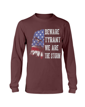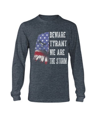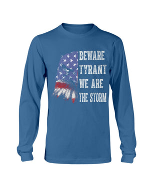 This shirt features a fierce eagle design blended with the American flag, paired with the powerful text: “BEWARE TYRANT WE ARE THE STORM.” A bold patriotic and activist statement, this shirt is perfect for those who stand against oppression and fight for freedom. Ideal for rallies, protests, or everyday wear, it symbolizes strength, unity, and resilience. A great gift for strong voices who believe in justice and democracy.