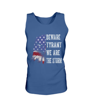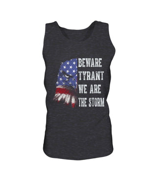 This shirt features a fierce eagle design blended with the American flag, paired with the powerful text: “BEWARE TYRANT WE ARE THE STORM.” A bold patriotic and activist statement, this shirt is perfect for those who stand against oppression and fight for freedom. Ideal for rallies, protests, or everyday wear, it symbolizes strength, unity, and resilience. A great gift for strong voices who believe in justice and democracy.