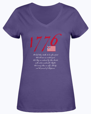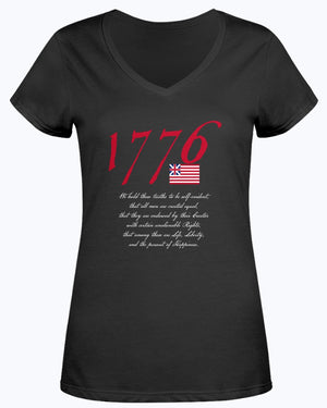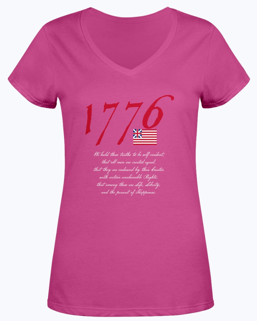 This patriotic shirt features the bold red number “1776” alongside an early American flag, symbolizing the birth of the United States. Below, the design displays the iconic handwritten-style quote from the Declaration of Independence: “We hold these truths to be self-evident, that all men are created equal…” highlighting the timeless ideals of liberty, equality, and unalienable rights. A powerful vintage-inspired design for history lovers and freedom supporters.