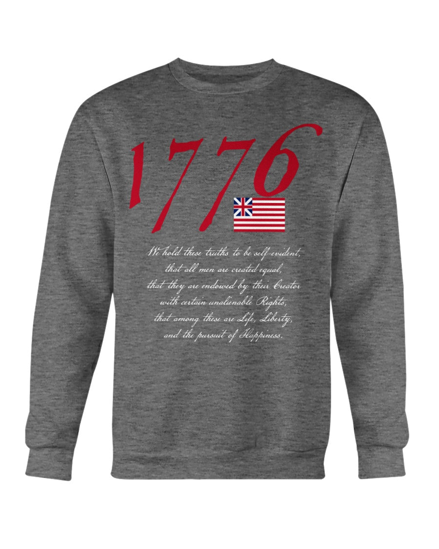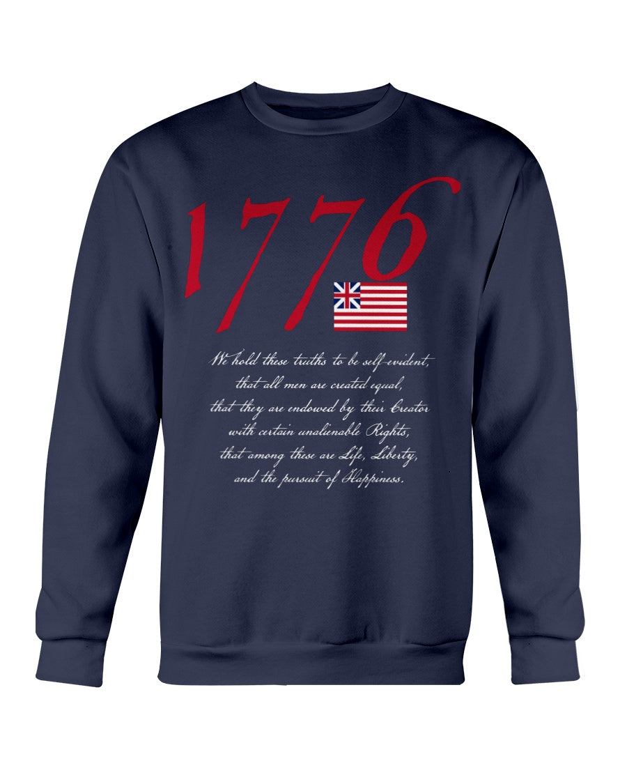 This patriotic shirt features the bold red number “1776” alongside an early American flag, symbolizing the birth of the United States. Below, the design displays the iconic handwritten-style quote from the Declaration of Independence: “We hold these truths to be self-evident, that all men are created equal…” highlighting the timeless ideals of liberty, equality, and unalienable rights. A powerful vintage-inspired design for history lovers and freedom supporters.