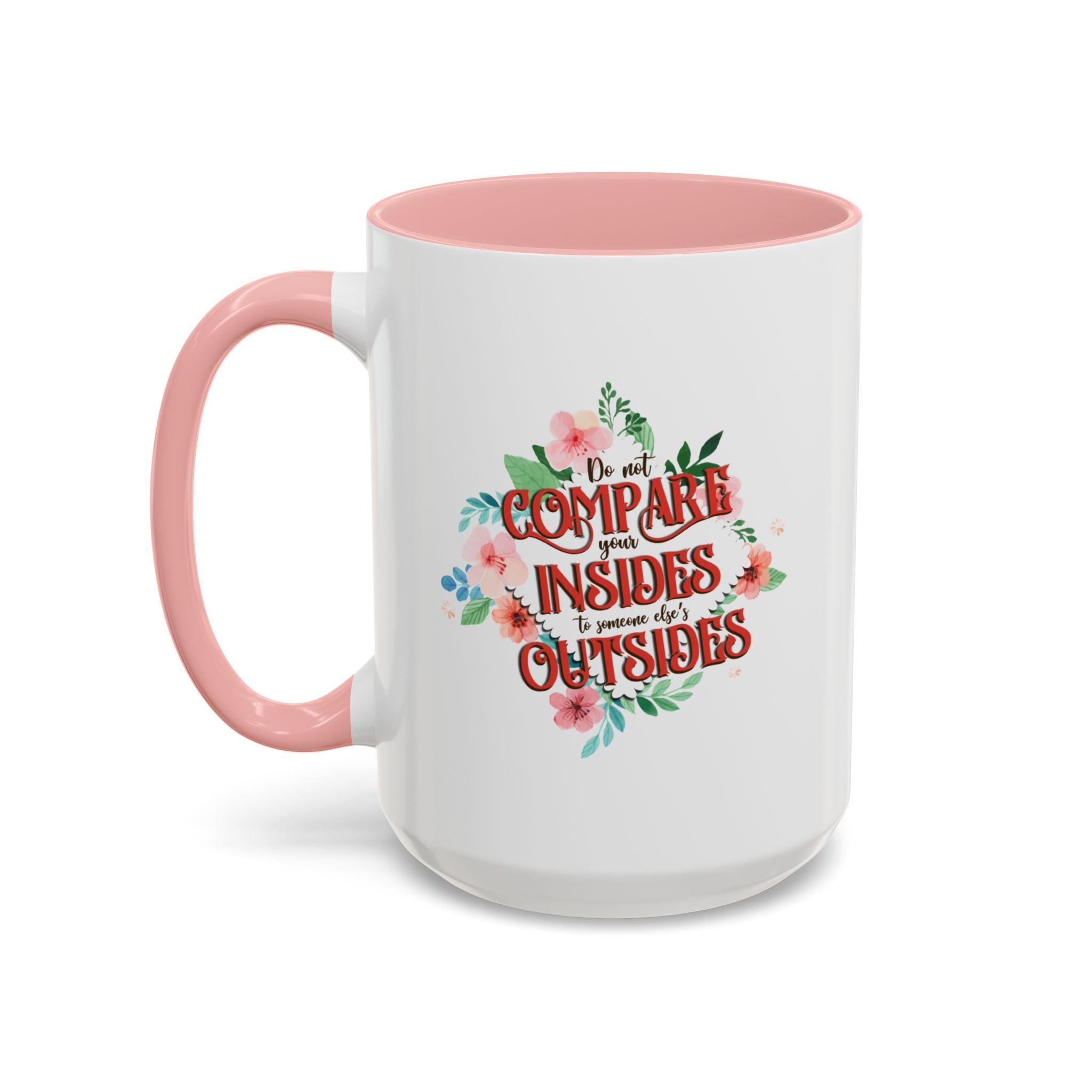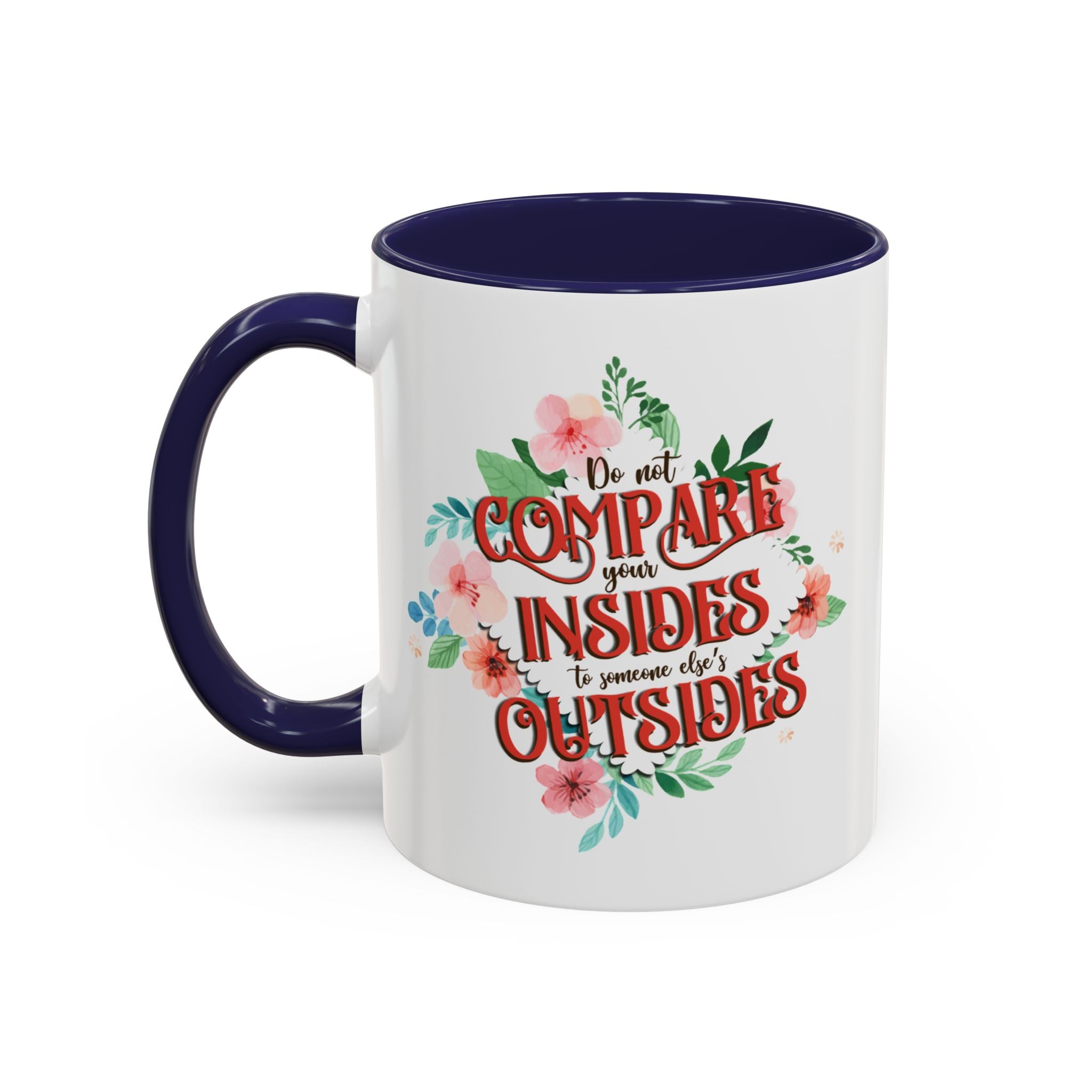 This accent mug features an inspiring floral design with the uplifting message: “DO NOT COMPARE YOUR INSIDES TO SOMEONE ELSE’S OUTSIDES.” Surrounded by colorful flowers and leaves, the red typography stands out beautifully against the white mug with a matching red handle and interior. Perfect as a daily reminder of self-love and positivity, this mug makes a thoughtful gift for women, friends, and anyone who values encouragement and mindfulness.