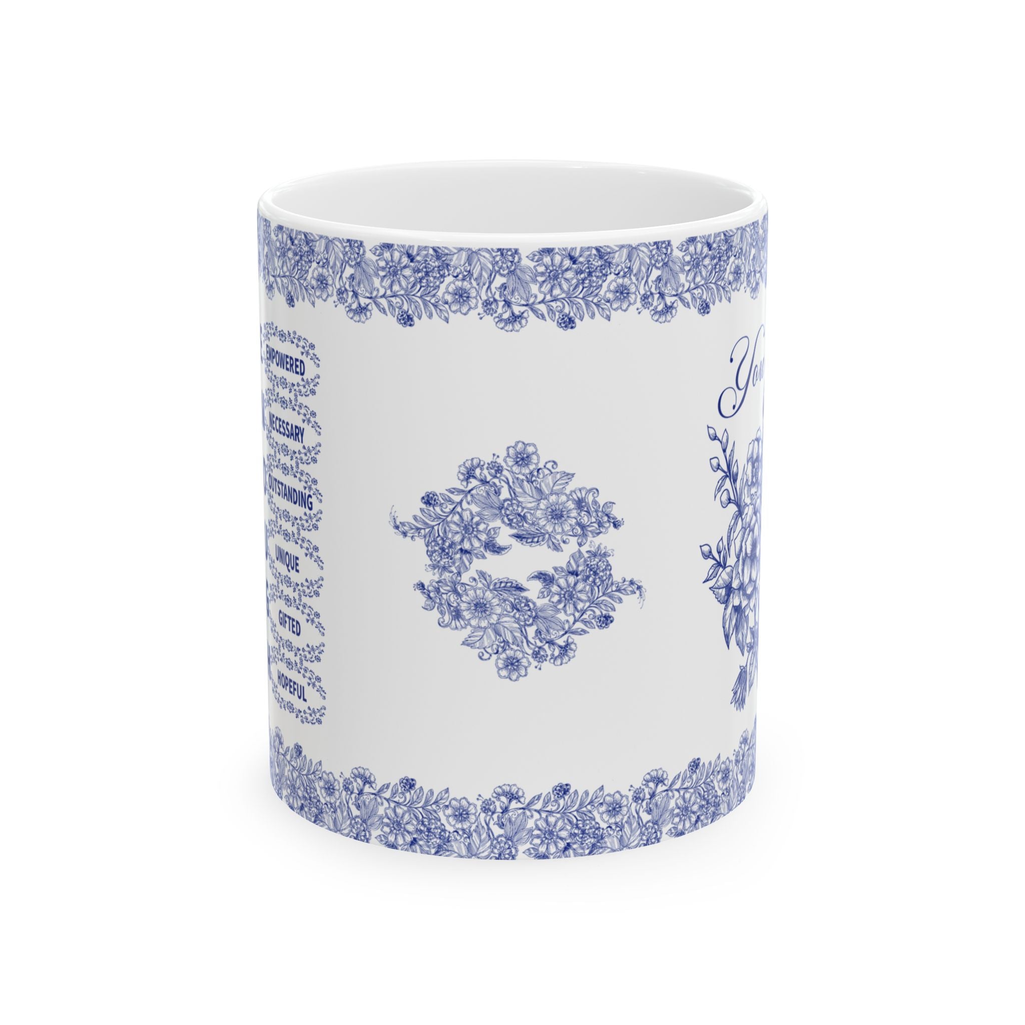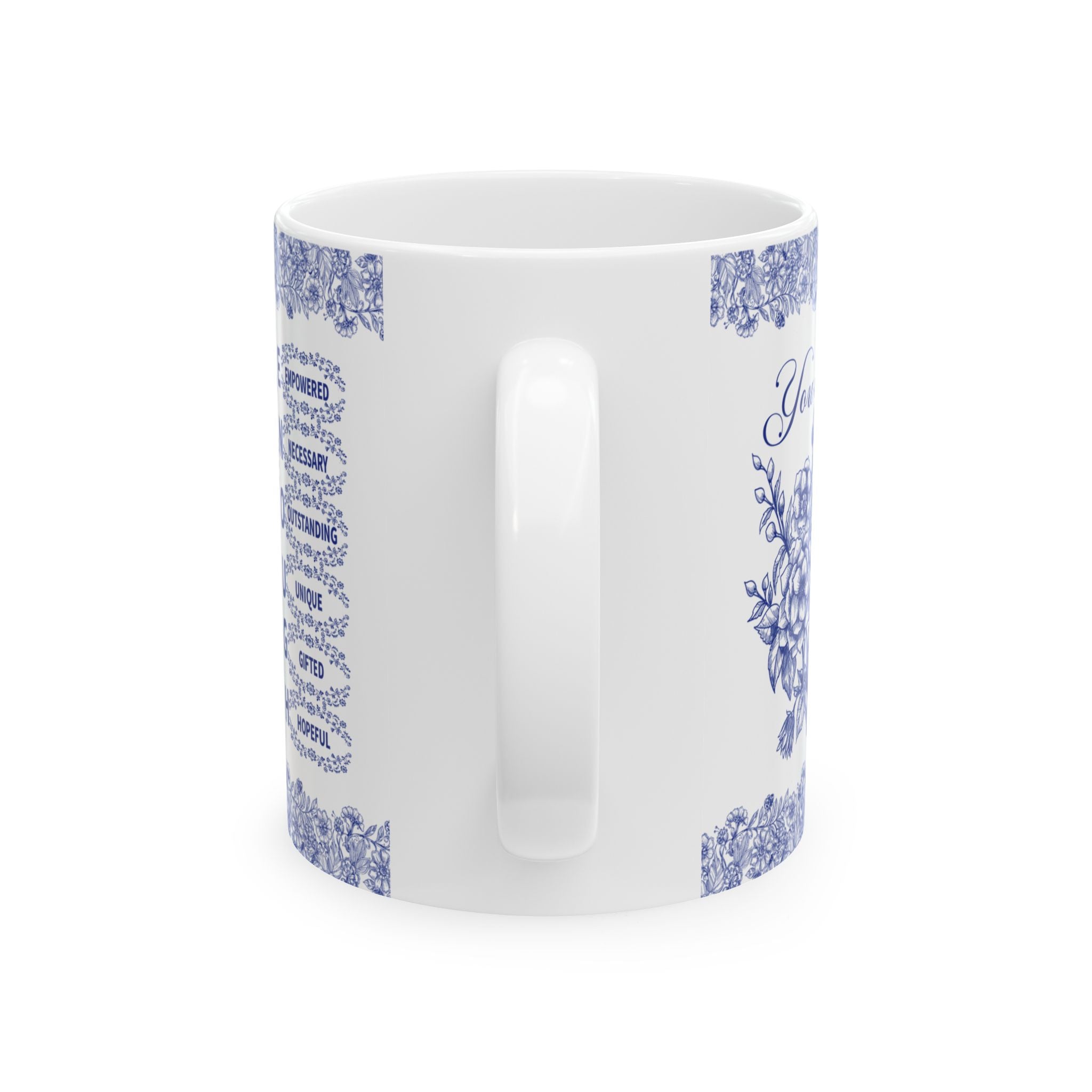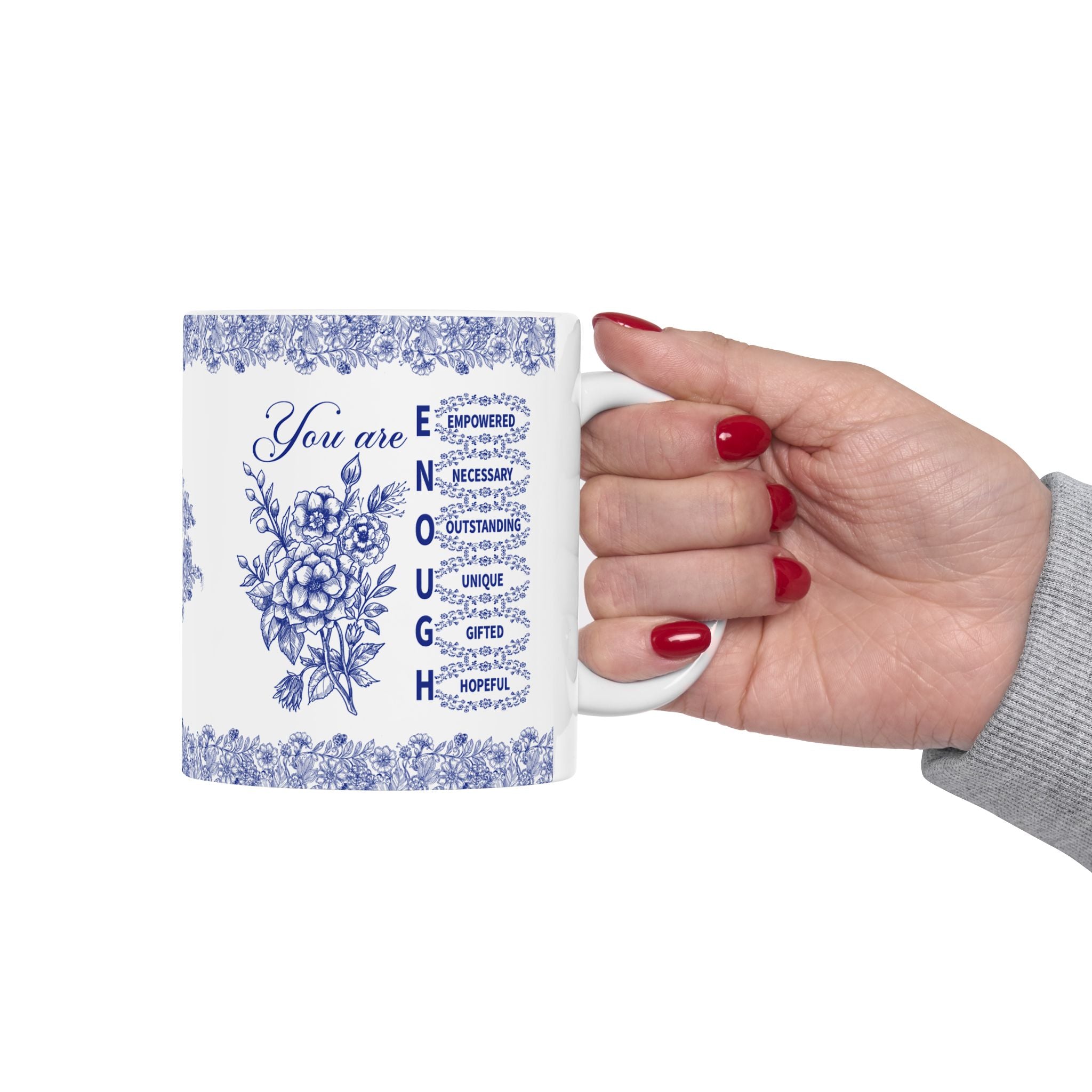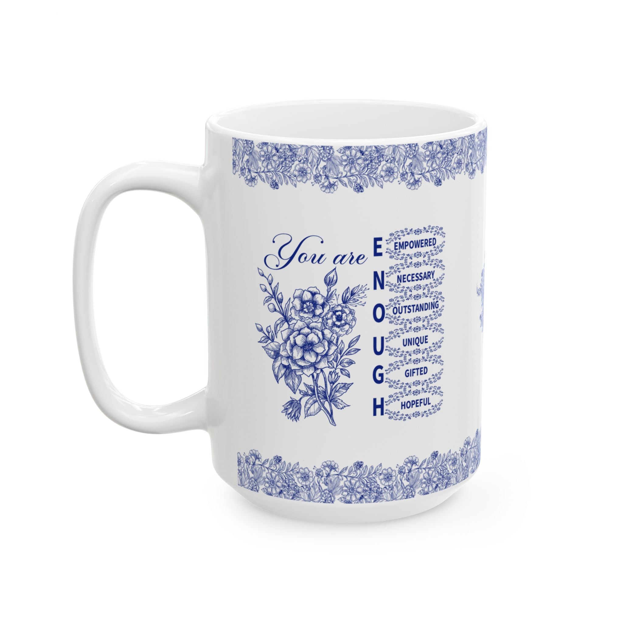 Start your day with a reminder of self-worth with this You Are Enough Ceramic Mug. The design features the uplifting message “You are Enough” alongside a creative acrostic: E – Empowered, N – Necessary, O – Outstanding, U – Unique, G – Gifted, H – Hopeful. Surrounded by delicate blue floral borders inspired by traditional ceramic artistry, this mug beautifully combines vintage elegance with modern empowerment. Perfect for coffee, tea, or as a daily boost of positivity, it makes a thoughtful gift for women, students, teachers, and anyone who deserves a reminder of their value.