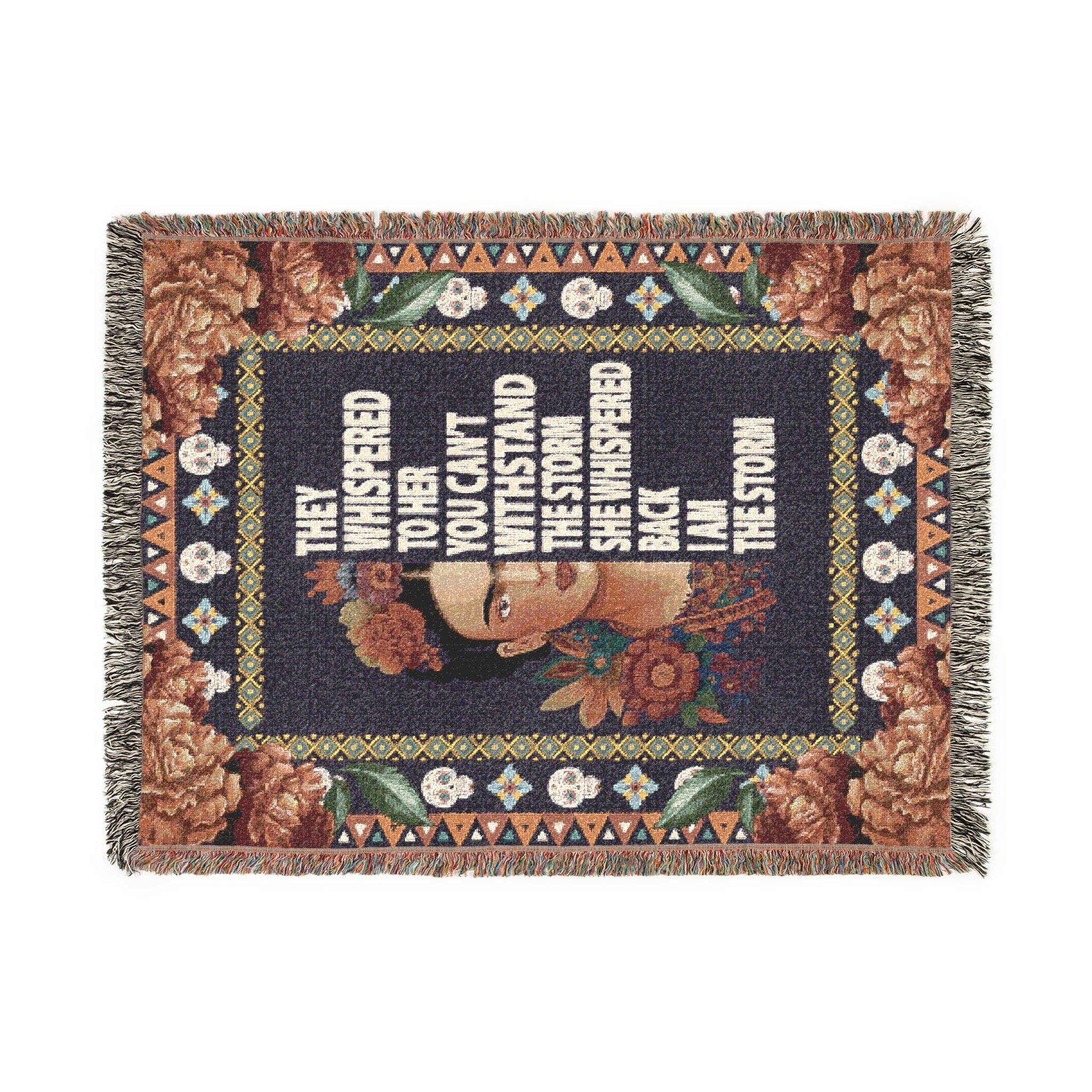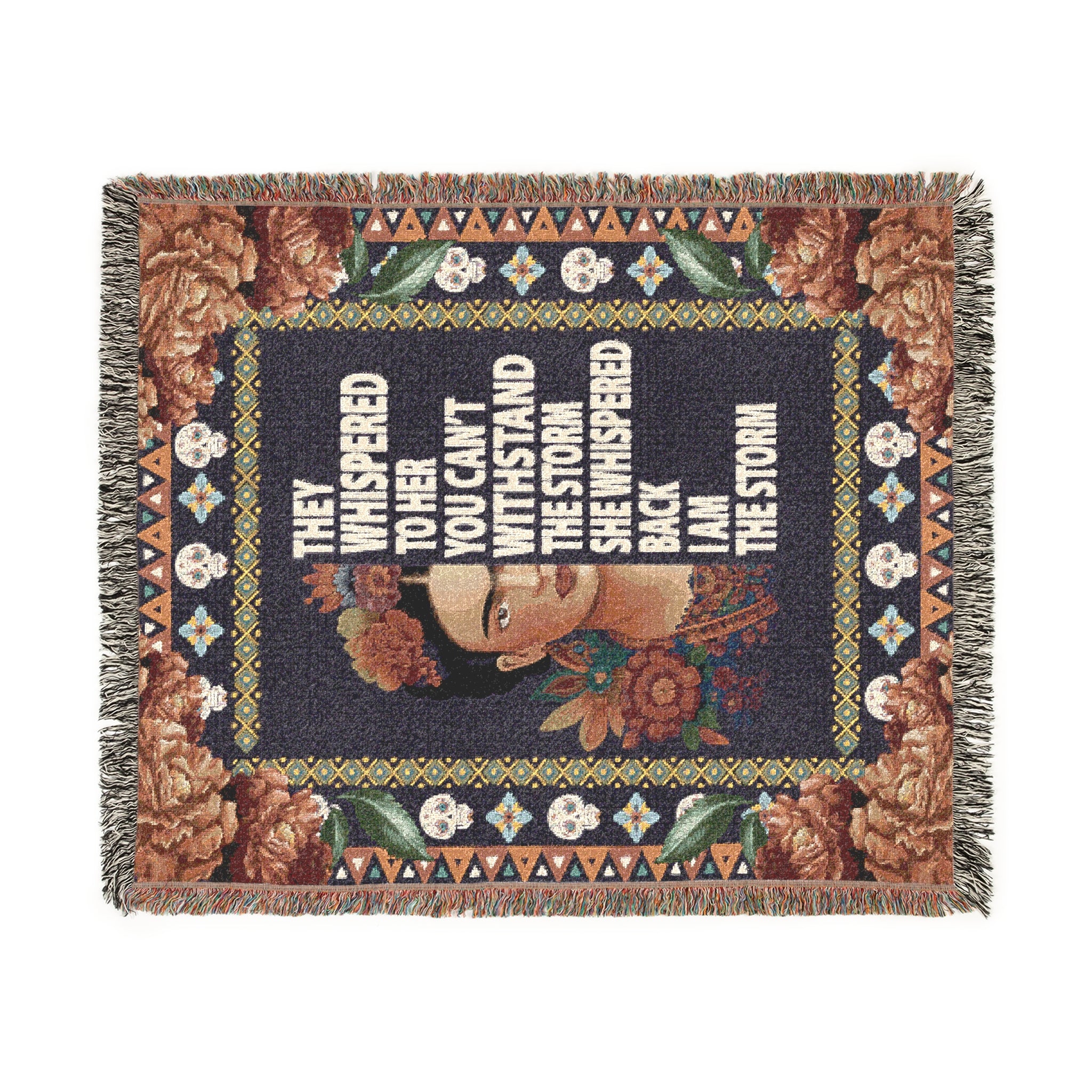 This woven blanket showcases a bold portrait of Frida Kahlo surrounded by floral and skull motifs, with the empowering text: “THEY WHISPERED TO HER YOU CAN’T WITHSTAND THE STORM SHE WHISPERED BACK I AM THE STORM.” A beautiful mix of art and inspiration, this blanket brings strength, resilience, and feminist spirit into any home. Perfect for women over 55, book lovers, and anyone who admires Frida Kahlo’s legacy. Use it as a cozy throw, a decorative tapestry, or a meaningful gift for strong women.