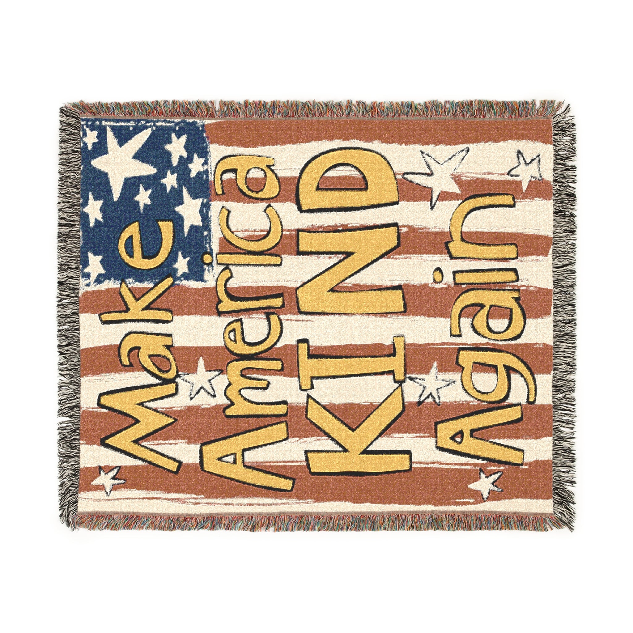 This woven blanket features the bold and uplifting text “MAKE AMERICA KIND AGAIN” over a rustic American flag background with stars and stripes. Soft, cozy, and full of meaning, this blanket carries a strong message of kindness and unity. Perfect for women over 55, activists, and anyone who believes in compassion and positive change. Use it as a warm throw, decorative tapestry, or a thoughtful gift that spreads kindness at home.