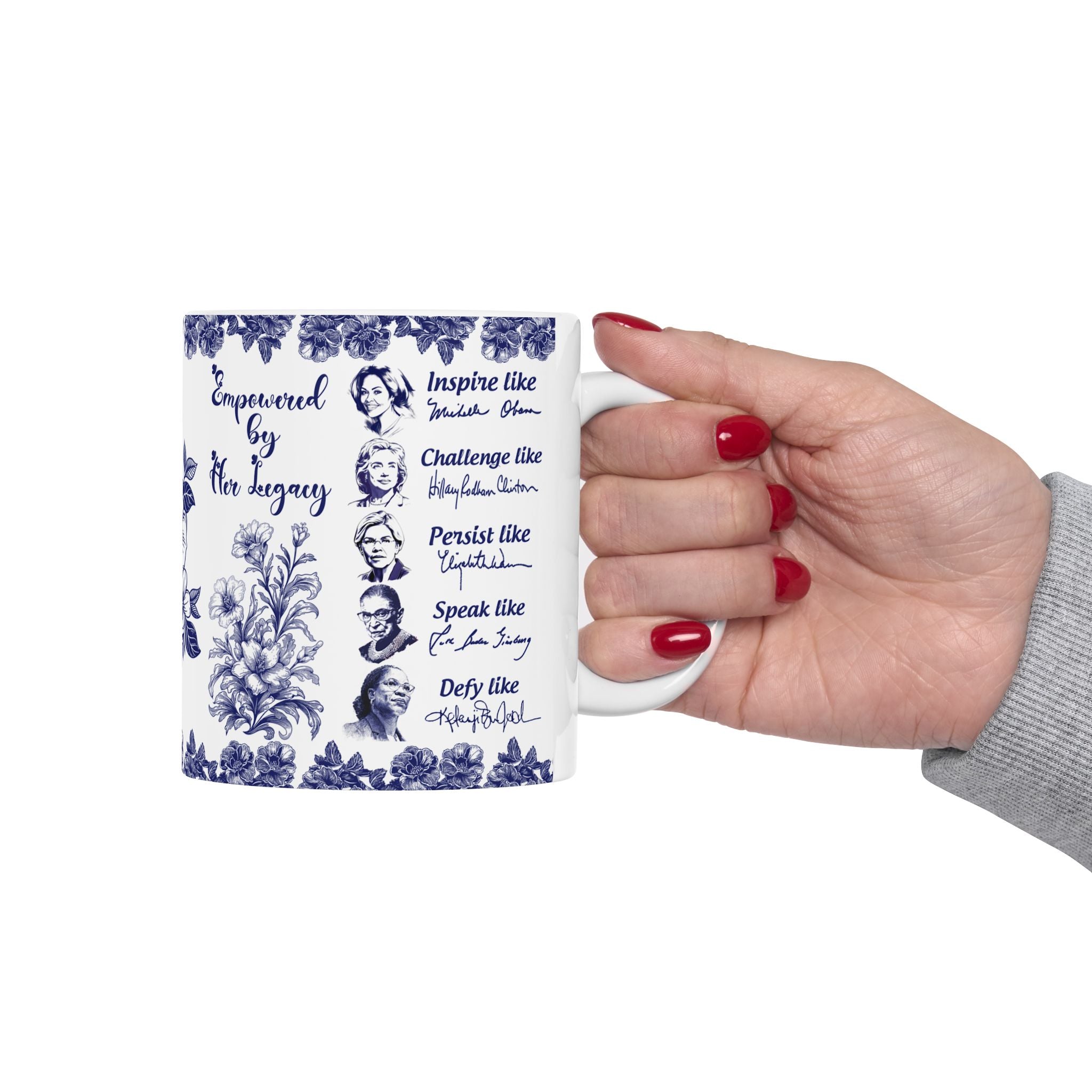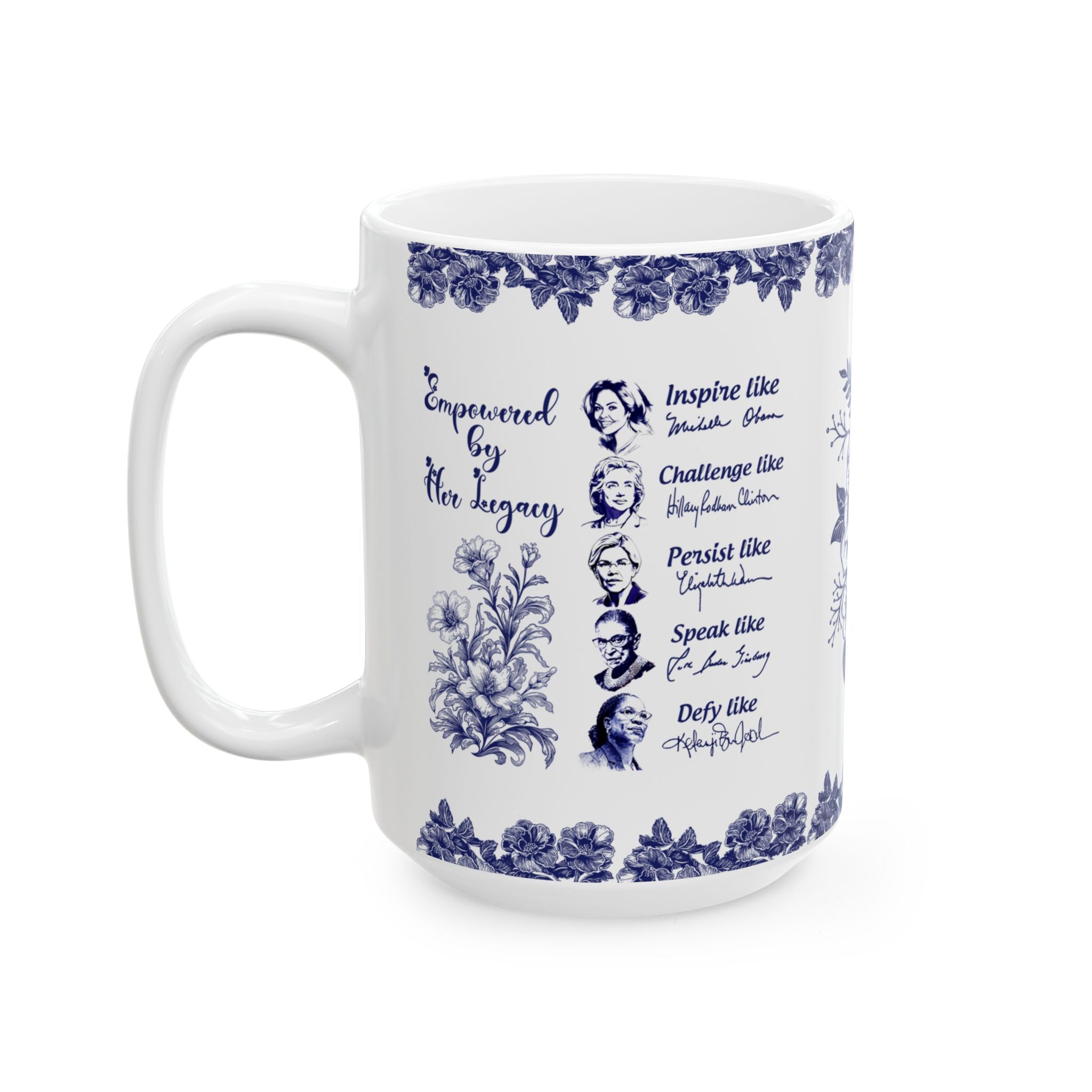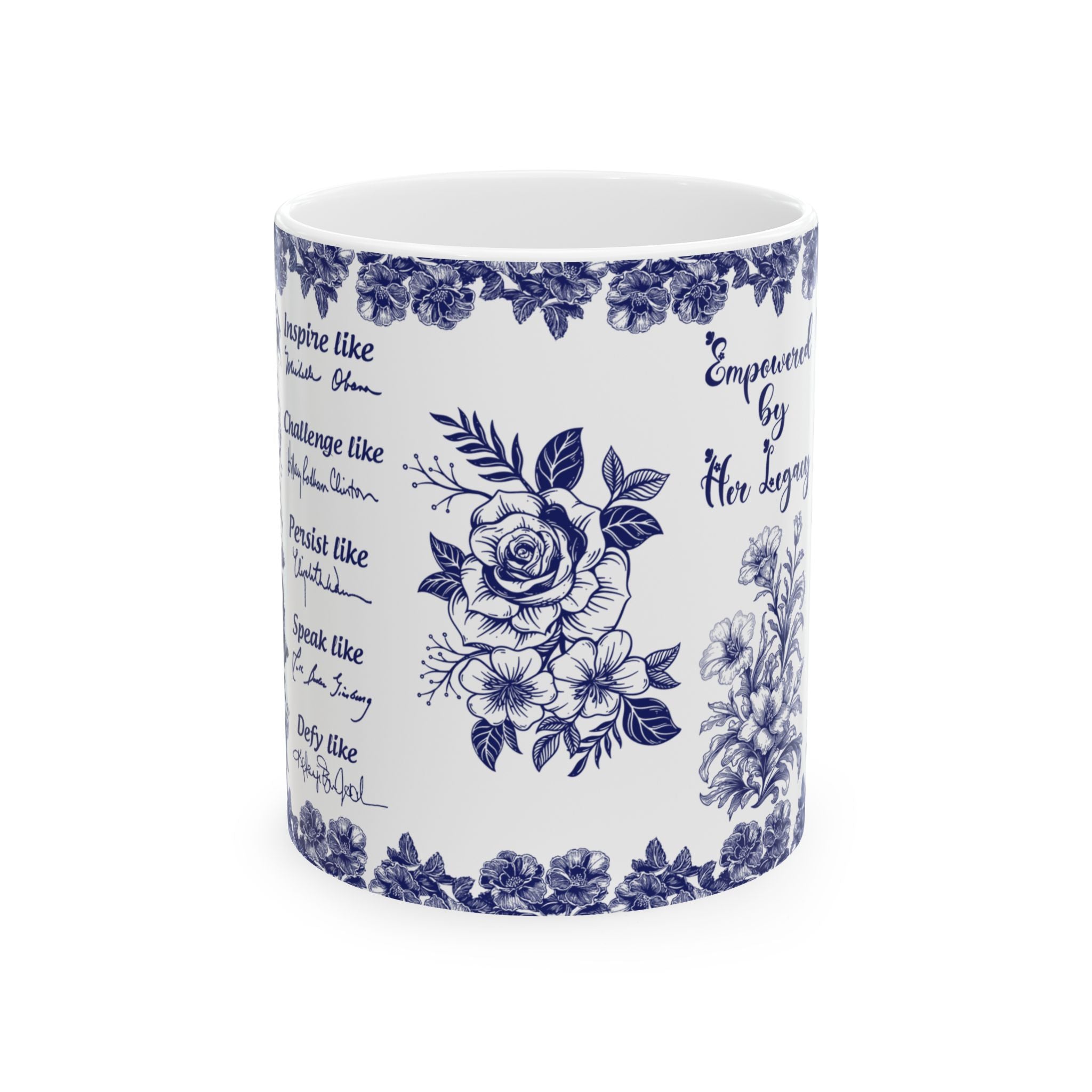 Celebrate the power and inspiration of women who changed history with this Empowered By Her Legacy Ceramic Mug. Featuring elegant blue floral art in a vintage porcelain style, the design proudly displays the empowering quote “Empowered by Her Legacy” alongside portraits and motivational lines.