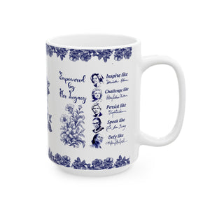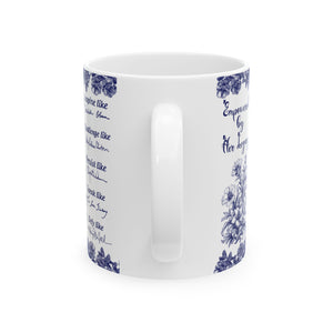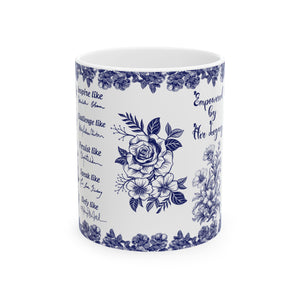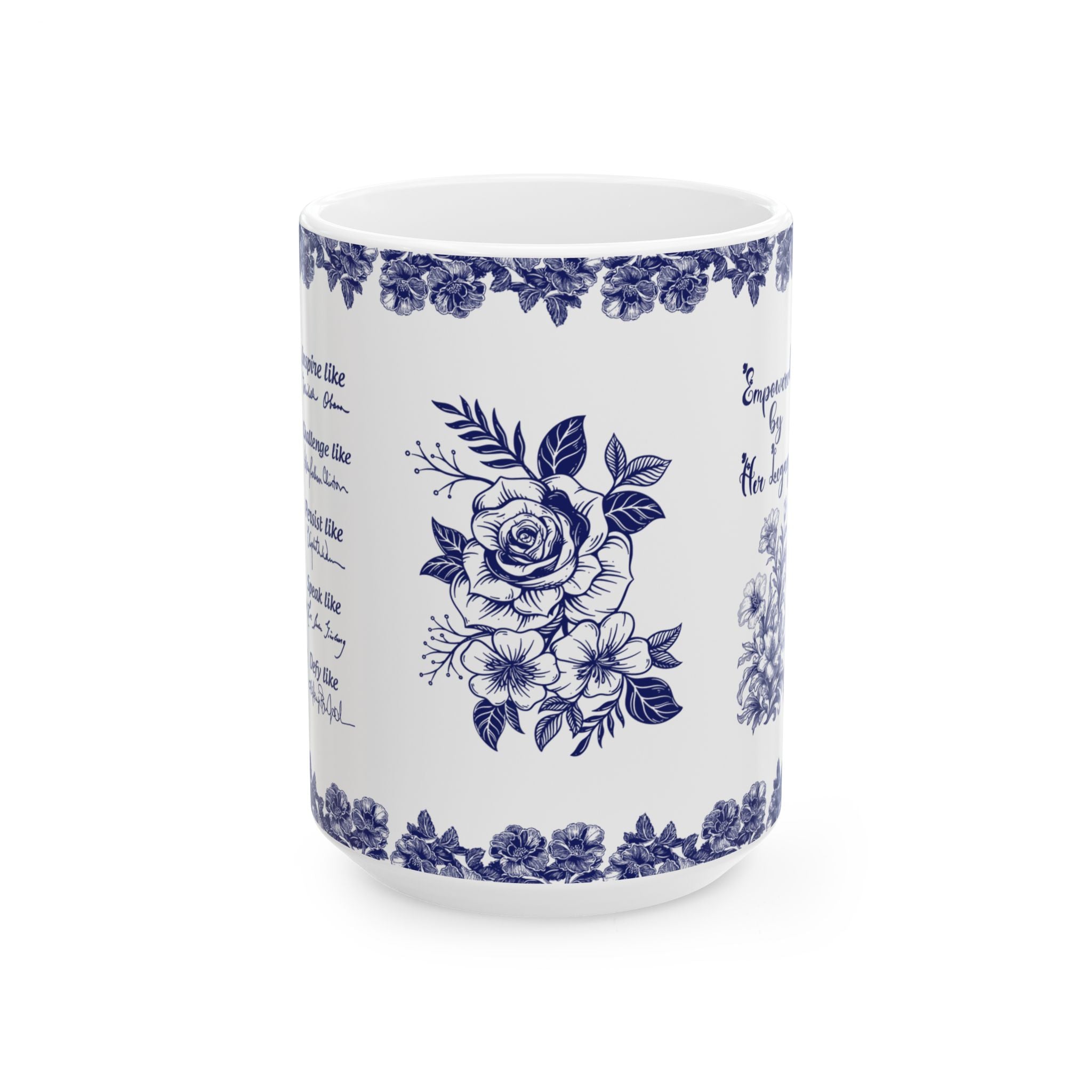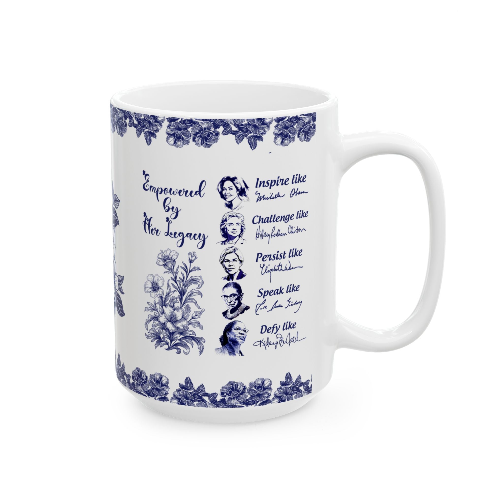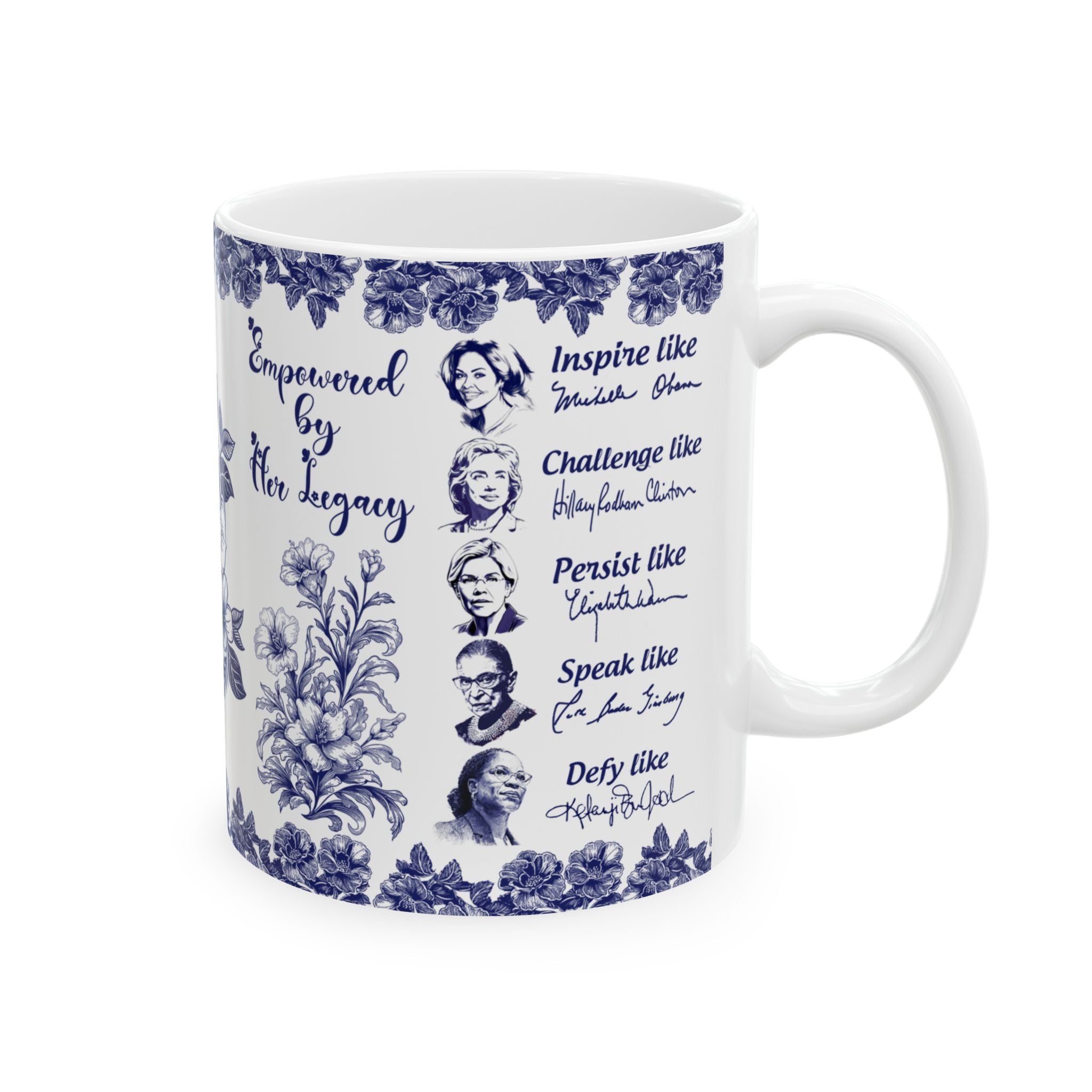 Celebrate the power and inspiration of women who changed history with this Empowered By Her Legacy Ceramic Mug. Featuring elegant blue floral art in a vintage porcelain style, the design proudly displays the empowering quote “Empowered by Her Legacy” alongside portraits and motivational lines.