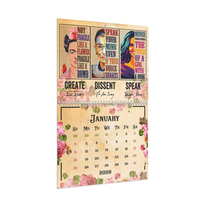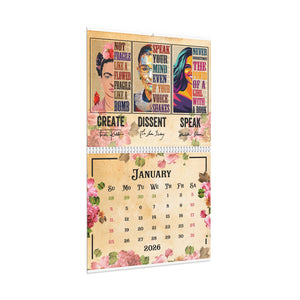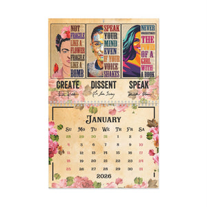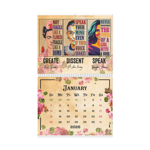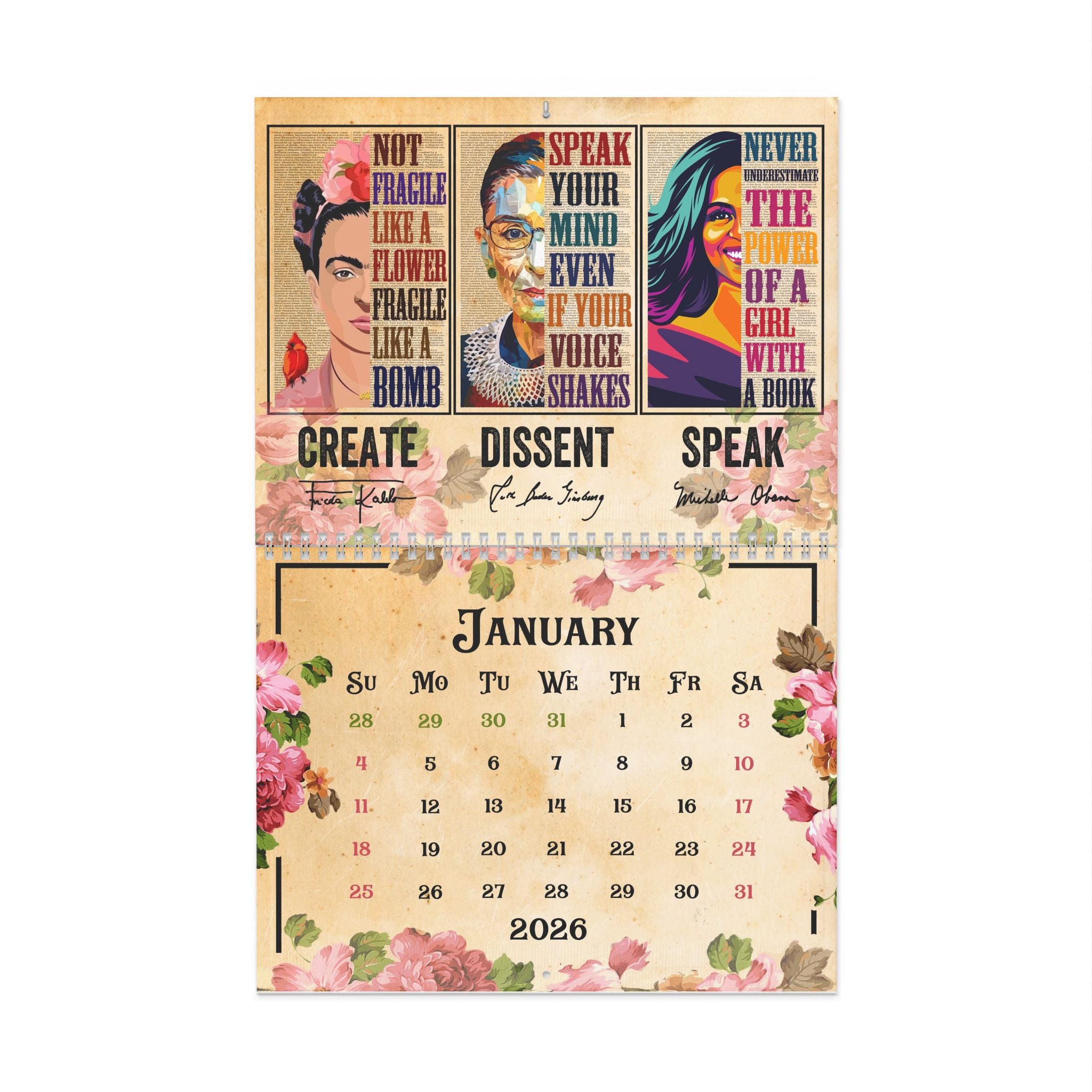 Celebrate strength and progress all year with this 2026 Women Empowerment Wall Calendar featuring inspiring portraits and bold quotes from iconic women. Each month showcases empowering texts such as “Well-behaved women rarely make history,” “When injustice becomes law, resistance becomes duty,” and “Not fragile like a flower, fragile like a bomb.” Designed with vintage floral accents and powerful feminist art, this calendar is perfect for activists, feminists, students, and history lovers. Stay organized while being inspired daily by voices of change and justice.