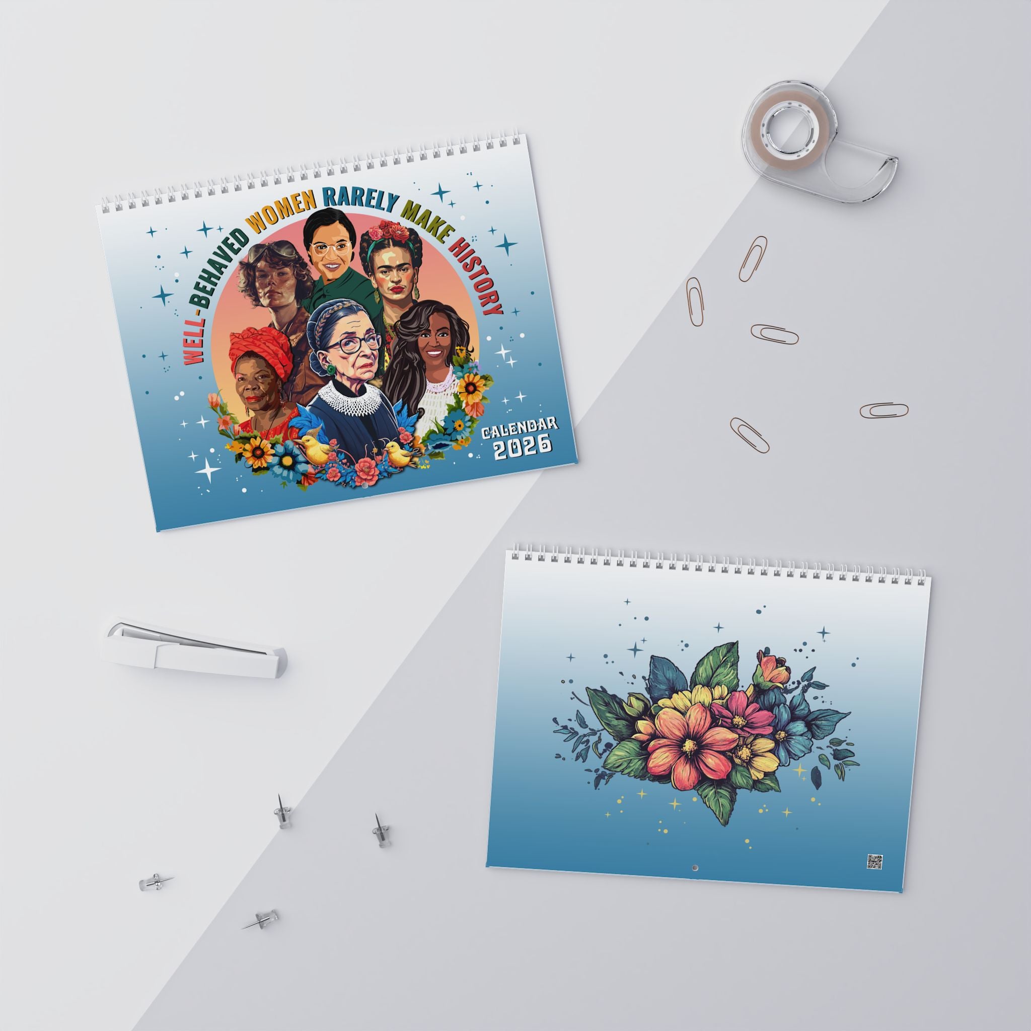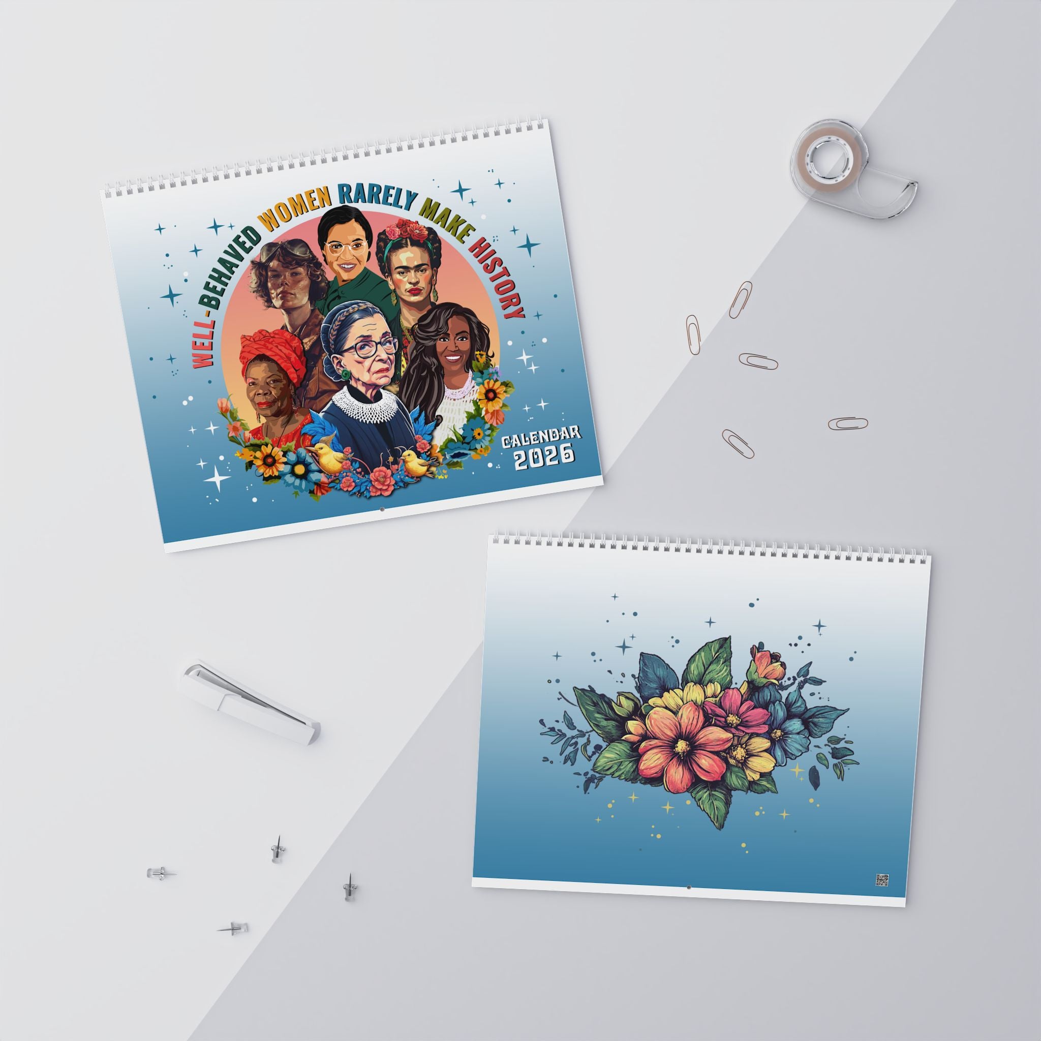 This 2026 wall calendar celebrates powerful women who changed history, featuring inspiring portraits and quotes from icons like Ruth Bader Ginsburg, Frida Kahlo, Michelle Obama, Rosa Parks, Amelia Earhart, and Maya Angelou. The cover proudly declares: “WELL-BEHAVED WOMEN RARELY MAKE HISTORY.” Each month highlights a different feminist leader with vibrant floral artwork and motivational quotes such as “Fight For The Things We Care About,” “Never Underestimate The Power Of A Girl With A Book,” and “But Still Like Air, I’ll Rise.” A perfect gift for feminists, book lovers, and women who value equality, courage, and empowerment.